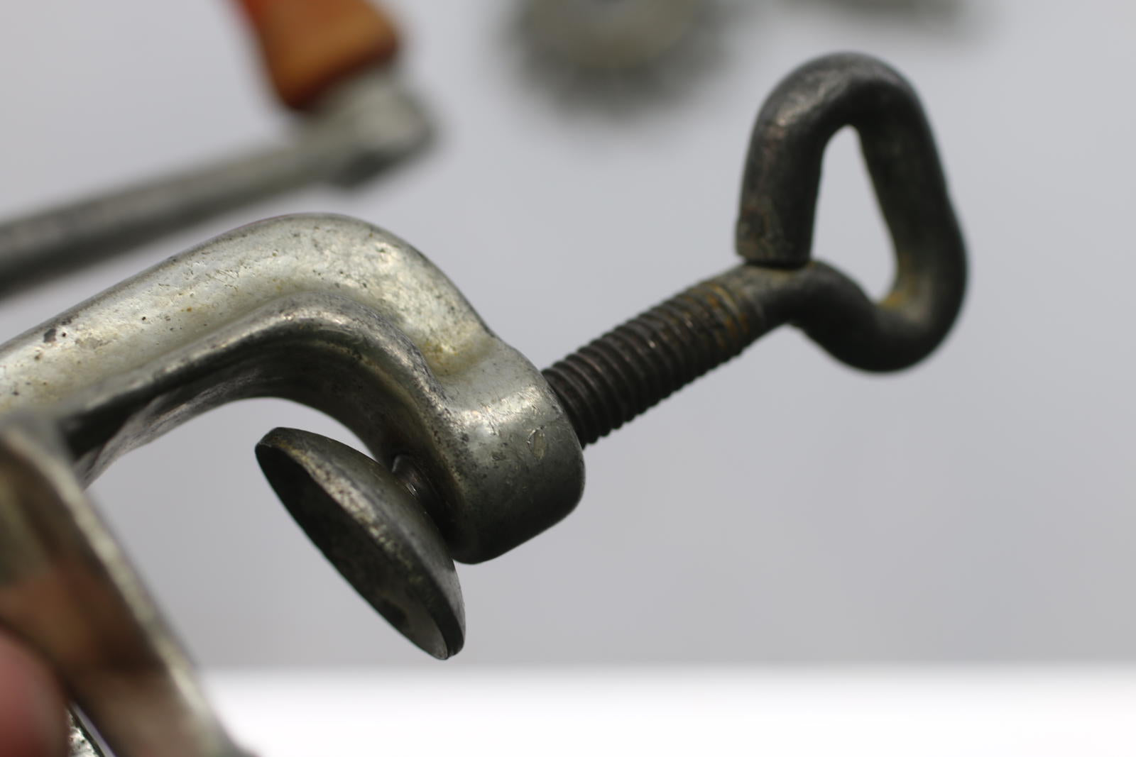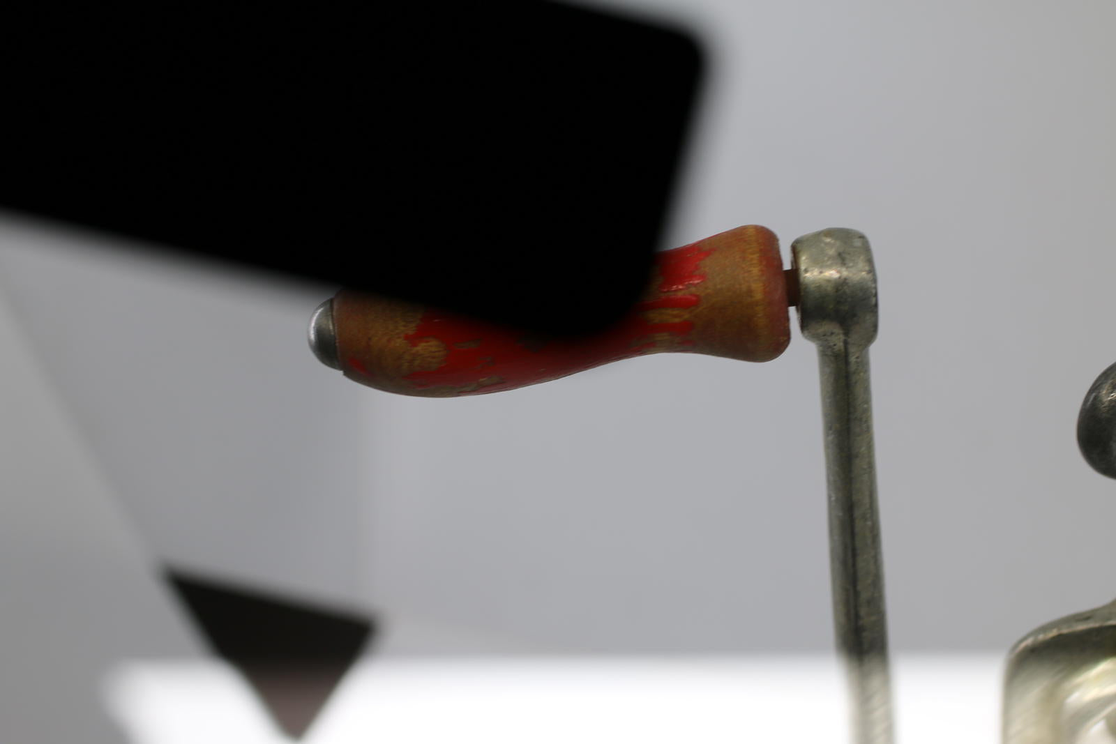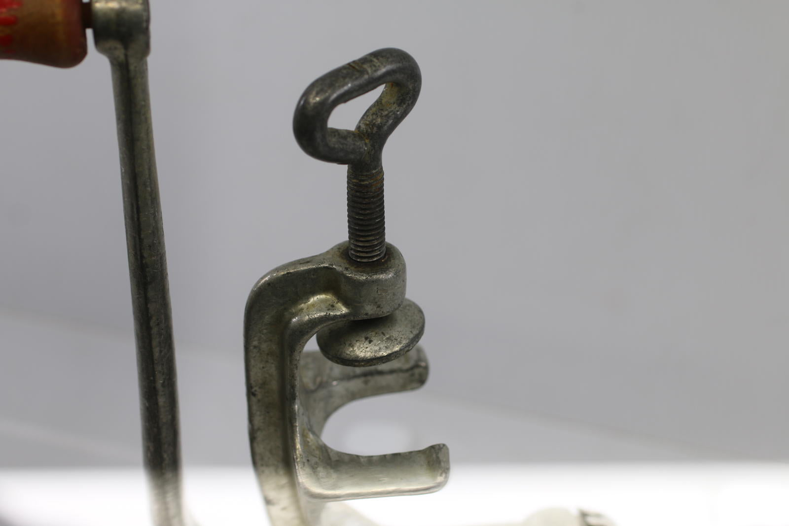 Heavy cast metal body with original red wooden crank handle. Classic clamp-on table mount design.