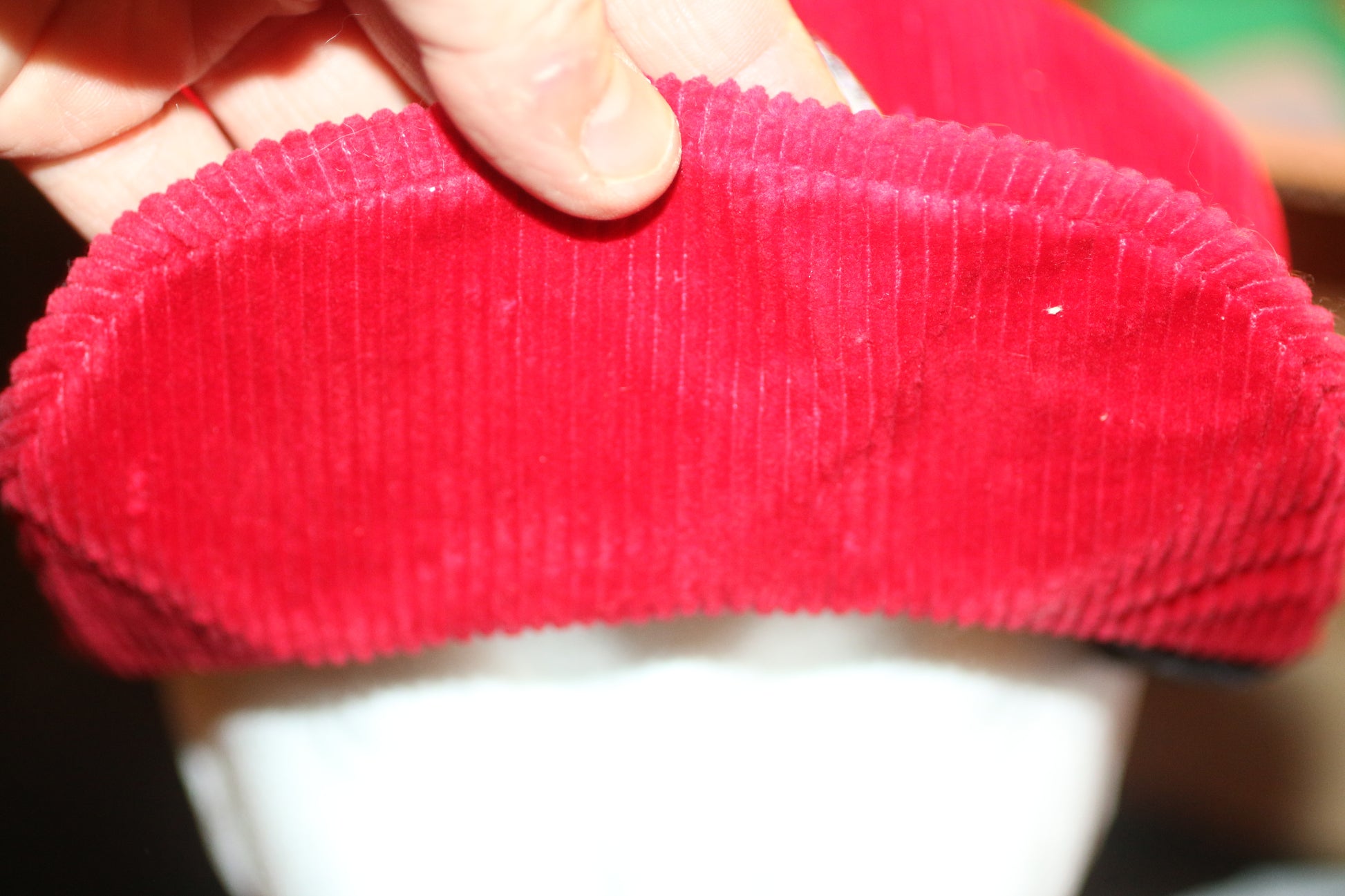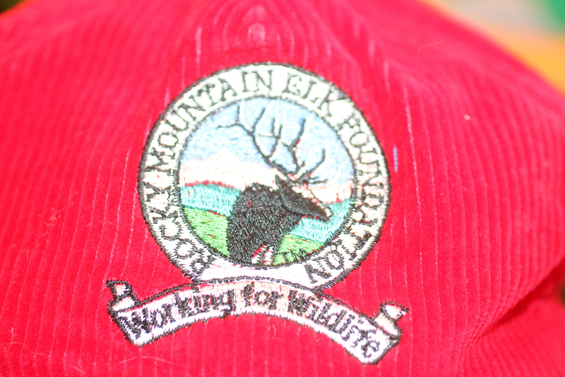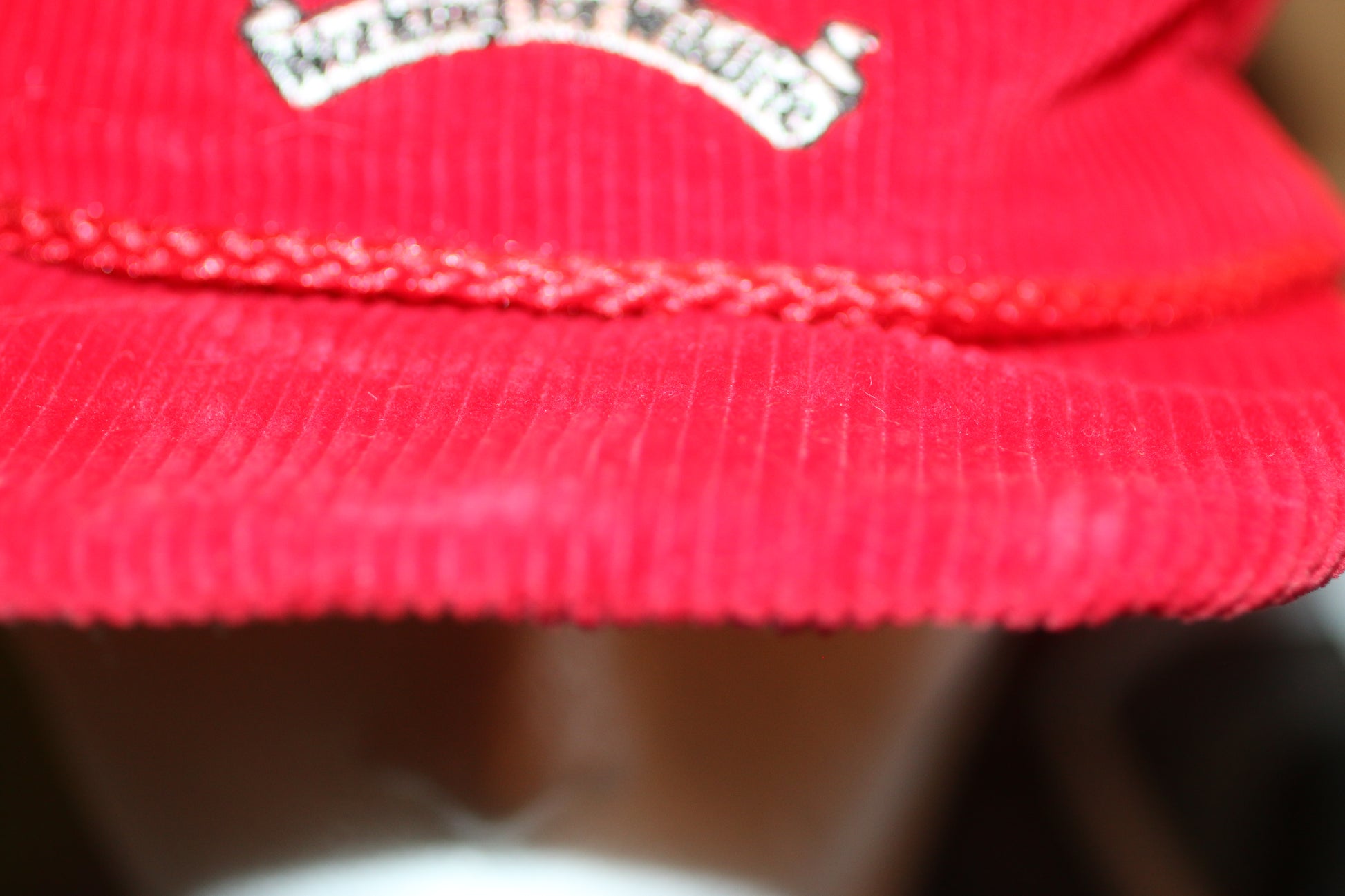 Vintage red corduroy strapback hat featuring an embroidered Moose Mountain Elk Lodge patch on the front.
