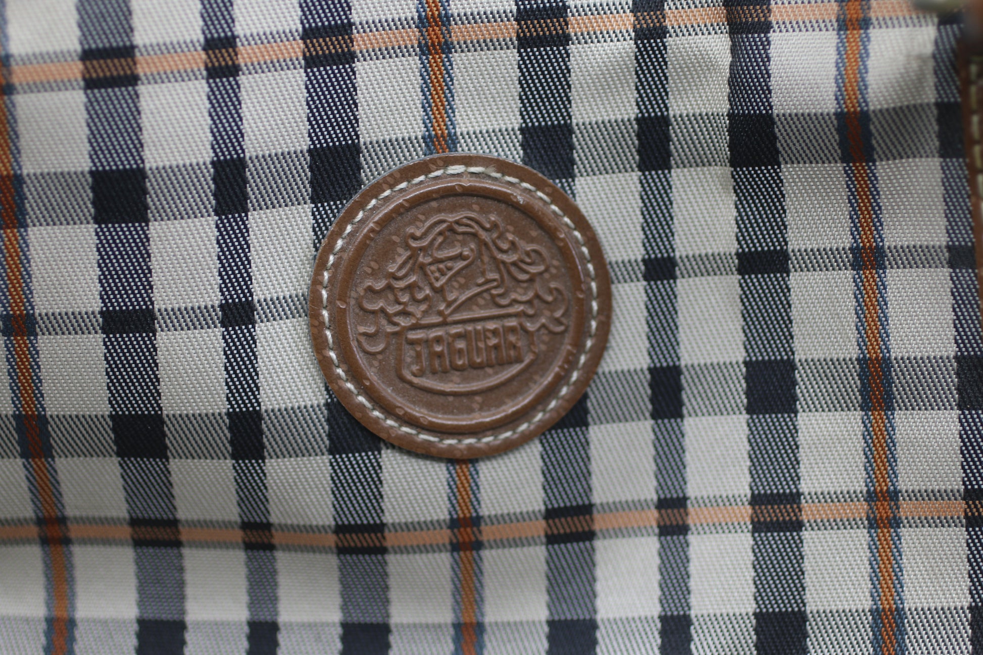 Vintage JAGUAR plaid travel duffle bag featuring classic check pattern with brown leather-look trim.