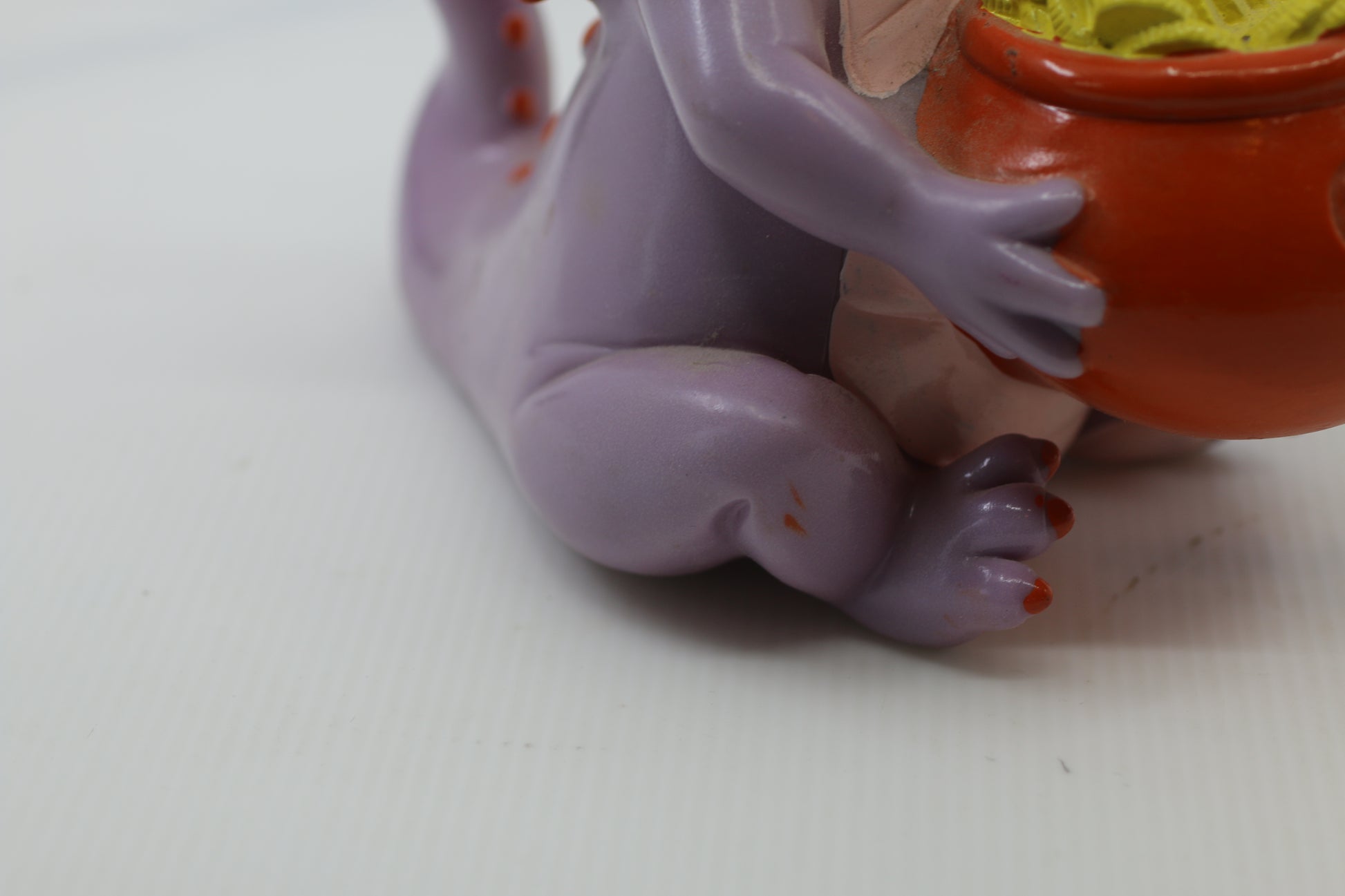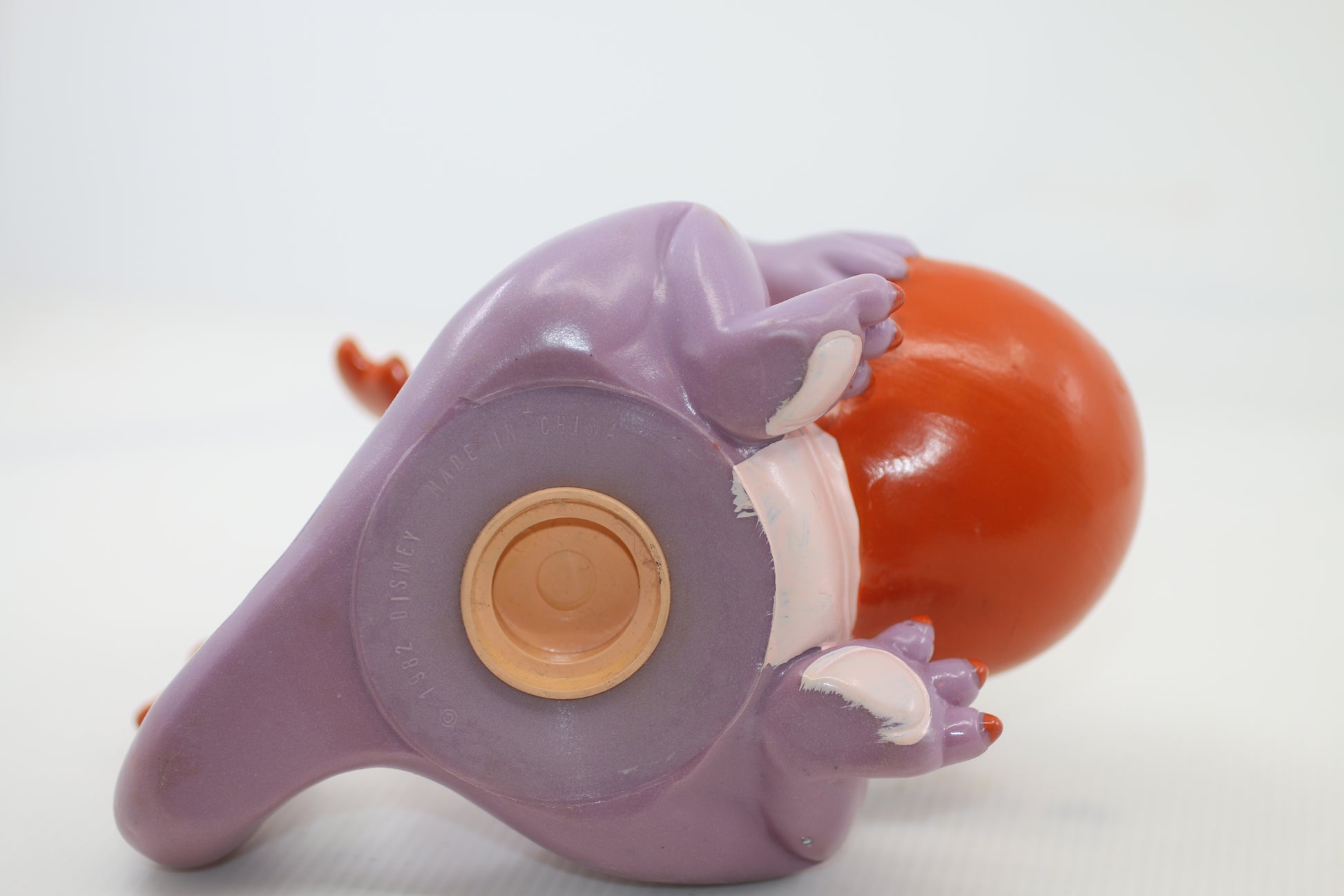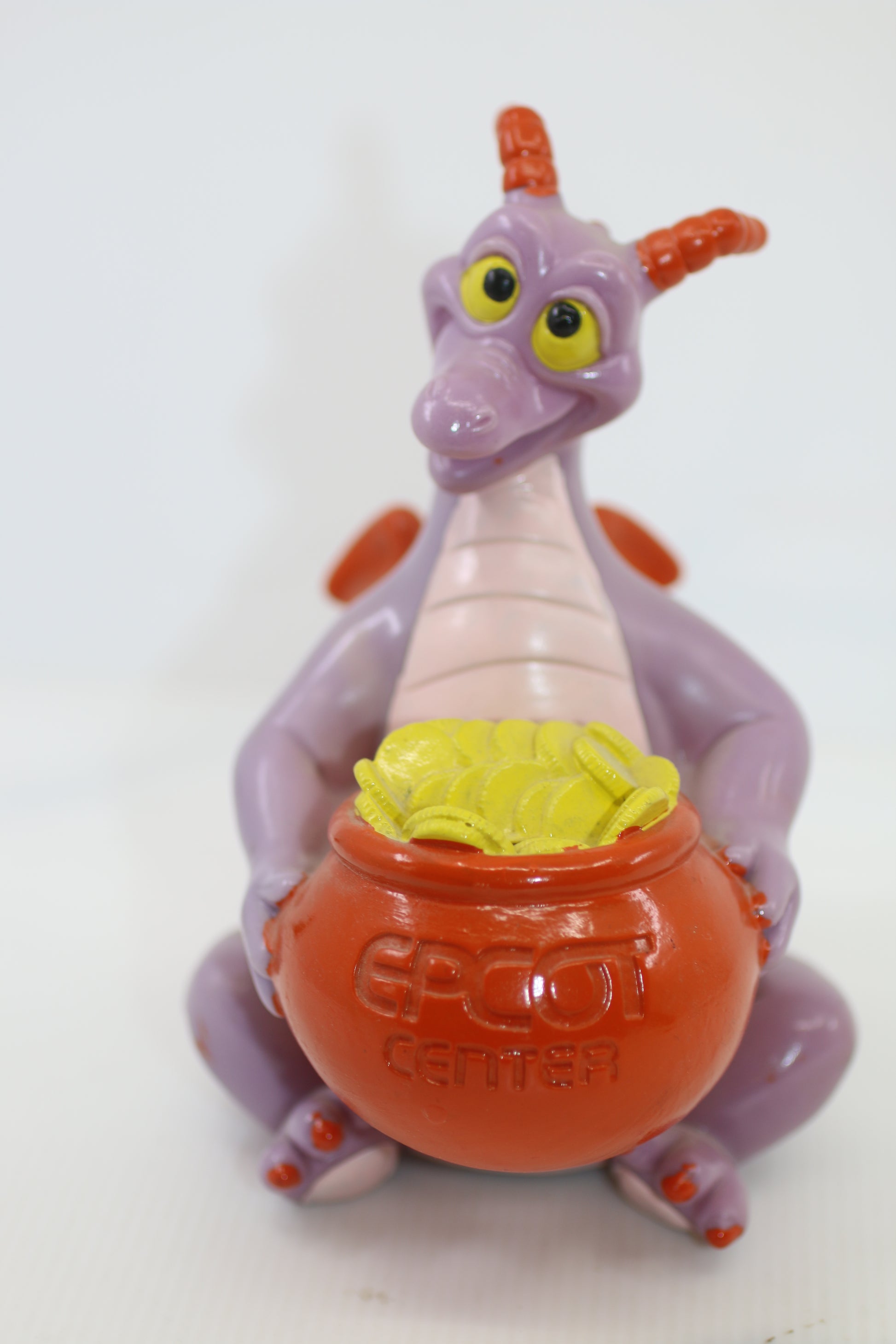 This classic purple Figment figure stands approximately 7 inches tall and features Figment holding a red EPCOT Center coin pot filled with sculpted coins. Made of vinyl, this piece was originally designed as a coin bank and remains a highly collectible early EPCOT souvenir.