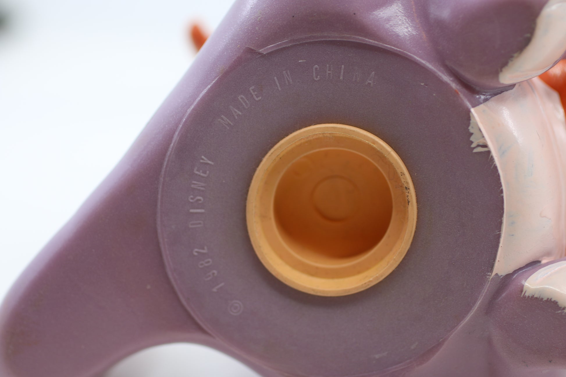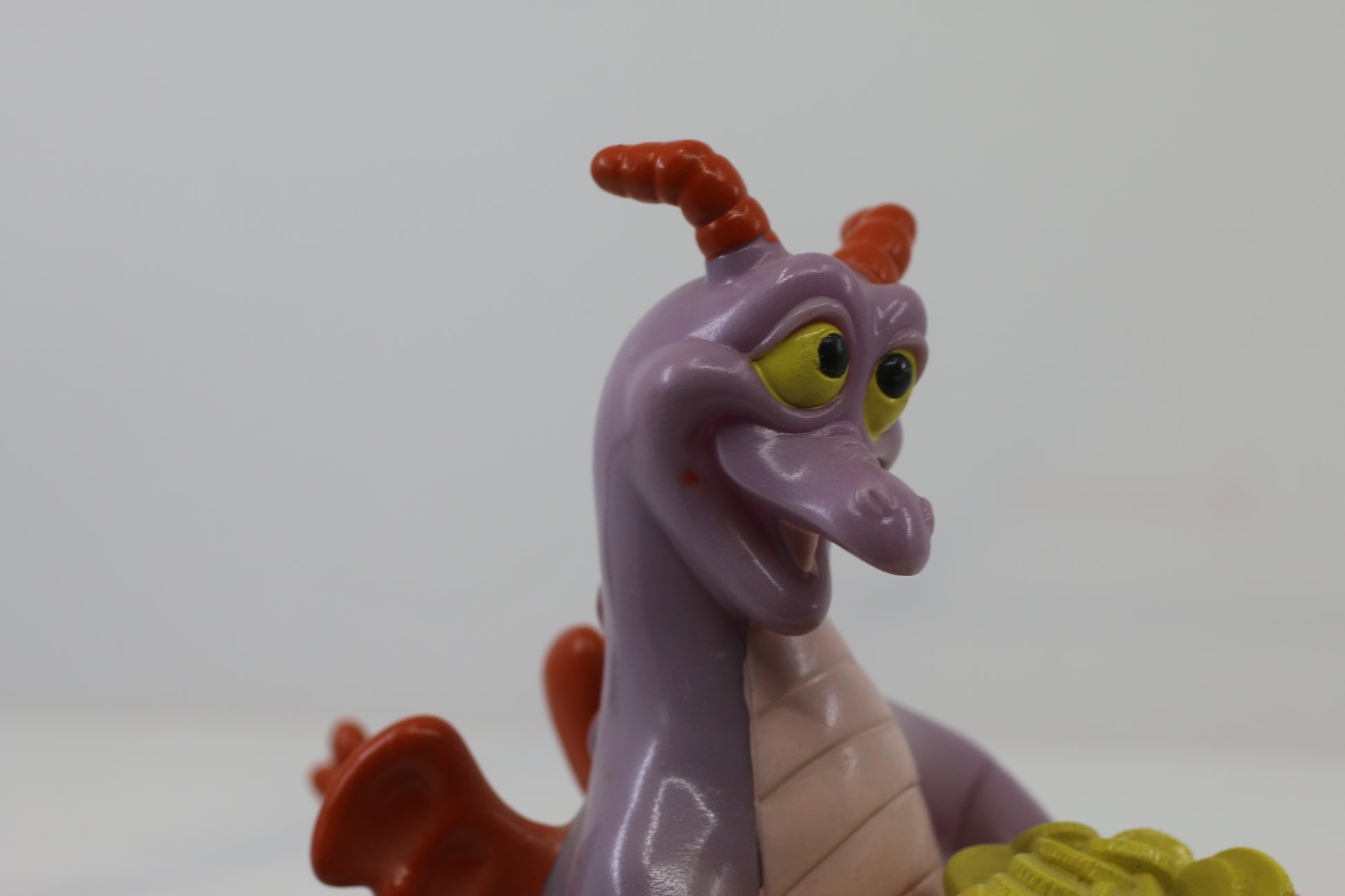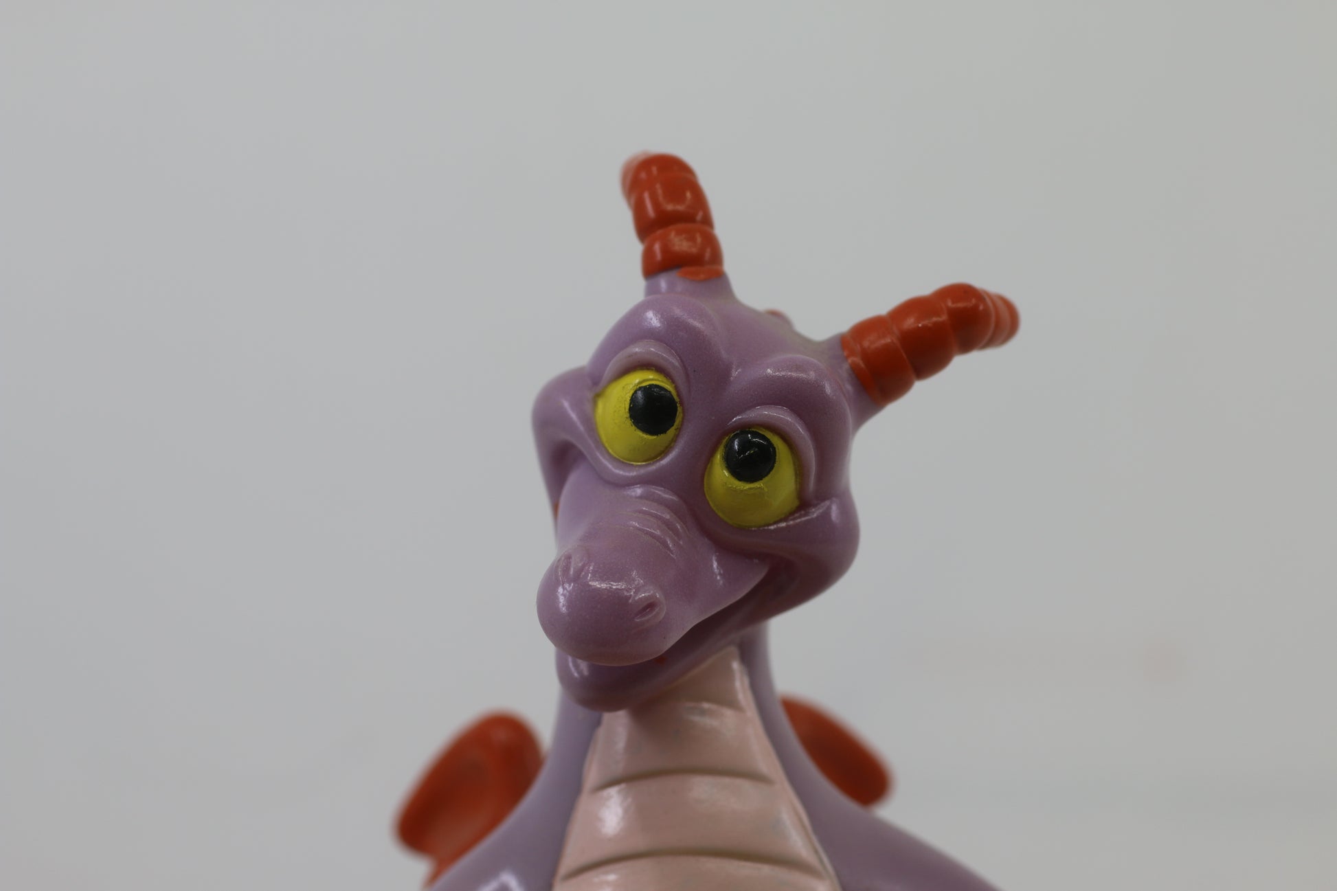 This classic purple Figment figure stands approximately 7 inches tall and features Figment holding a red EPCOT Center coin pot filled with sculpted coins. Made of vinyl, this piece was originally designed as a coin bank and remains a highly collectible early EPCOT souvenir.