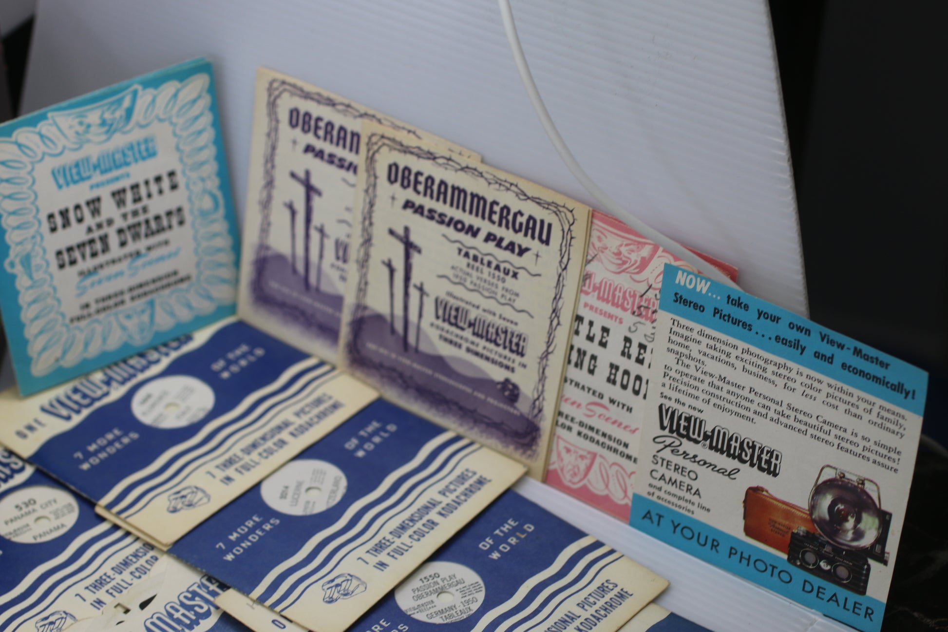 “Vintage View-Master lot including viewer (white/blue lever) and large reel collection. Mix of Travel / Canada / Vatican / Italy / Switzerland / Caribbean plus highlights like Fairy Tales (Snow White / Little Red Riding Hood), Queen Elizabeth II Coronation (1953), Oberammergau Passion Play, and Special Places (SP series).