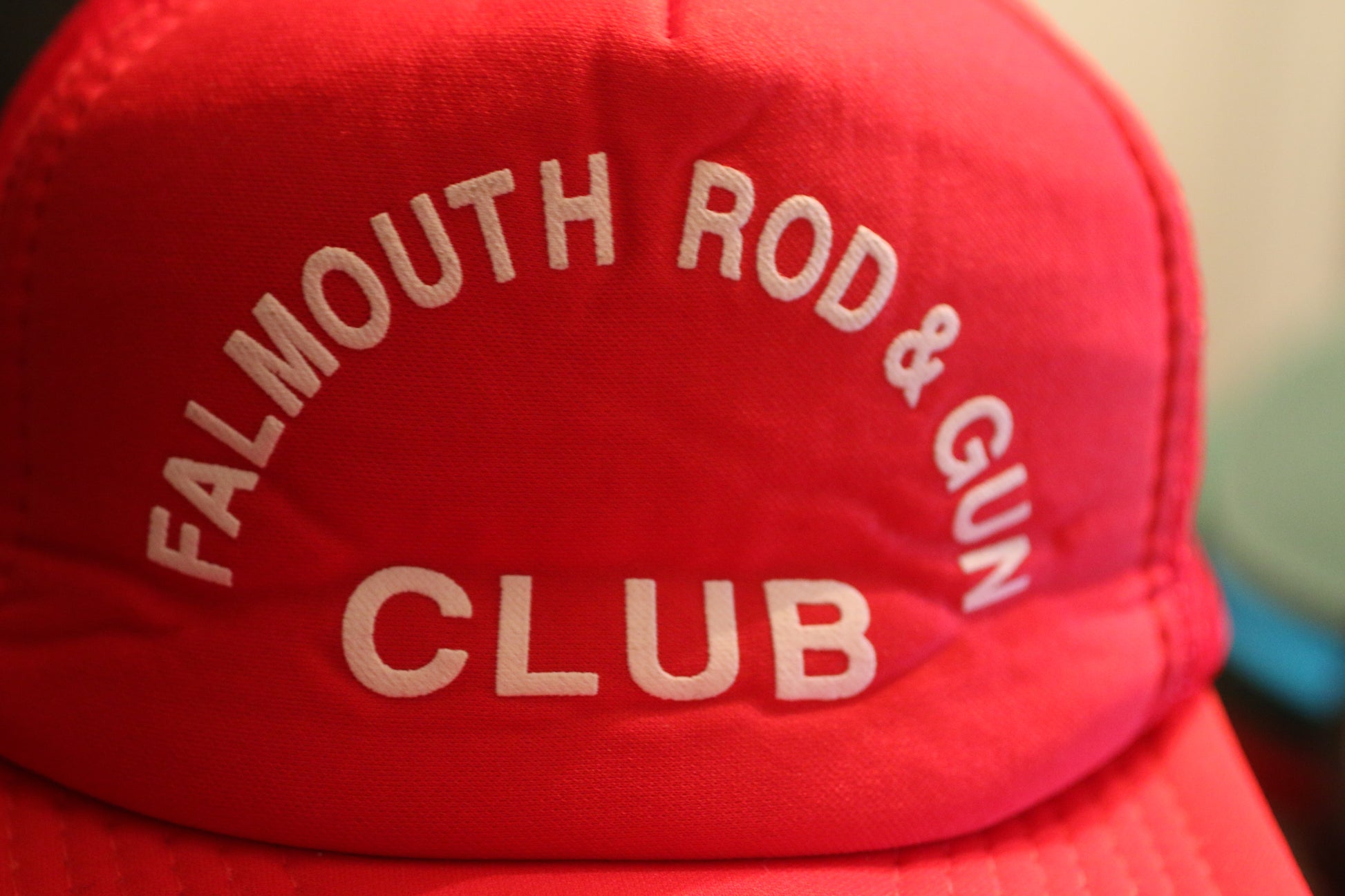 Vintage Falmouth Rod & Gun Club red trucker-style cap featuring bold white front lettering. A classic shooting / fishing club promotional hat with strong outdoors and Americana appeal.