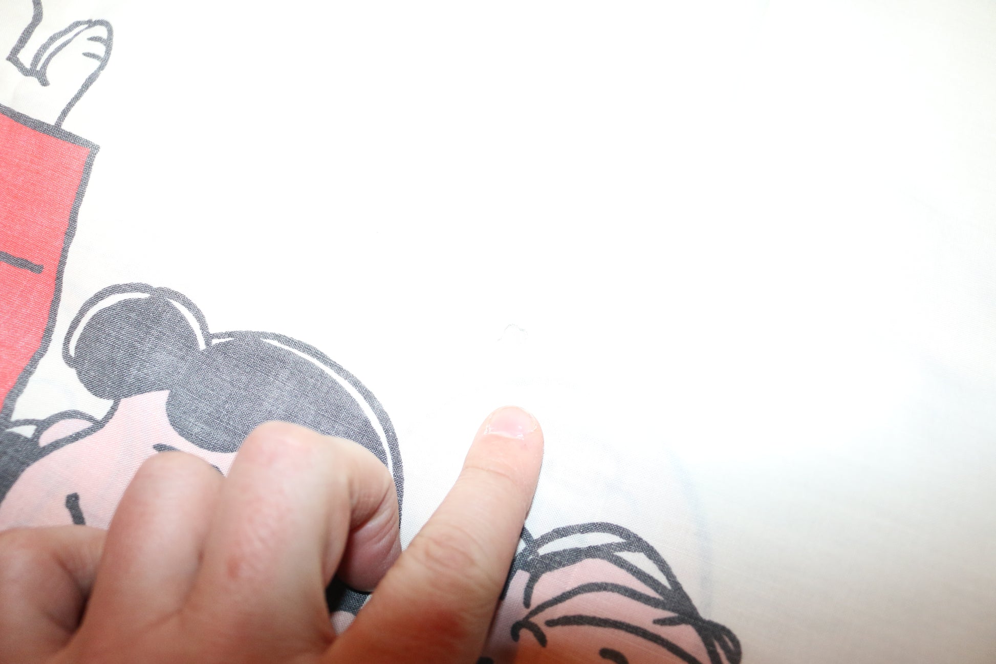 Vintage Peanuts pillowcase featuring Snoopy and the Peanuts gang with the quote “Happiness is being one of the gang.” Artwork by Charles M. Schulz.