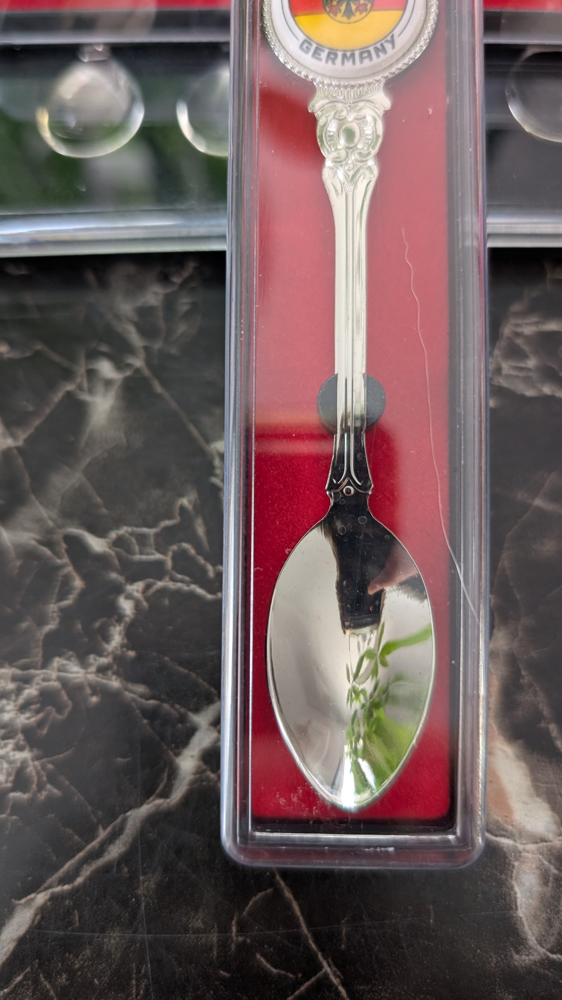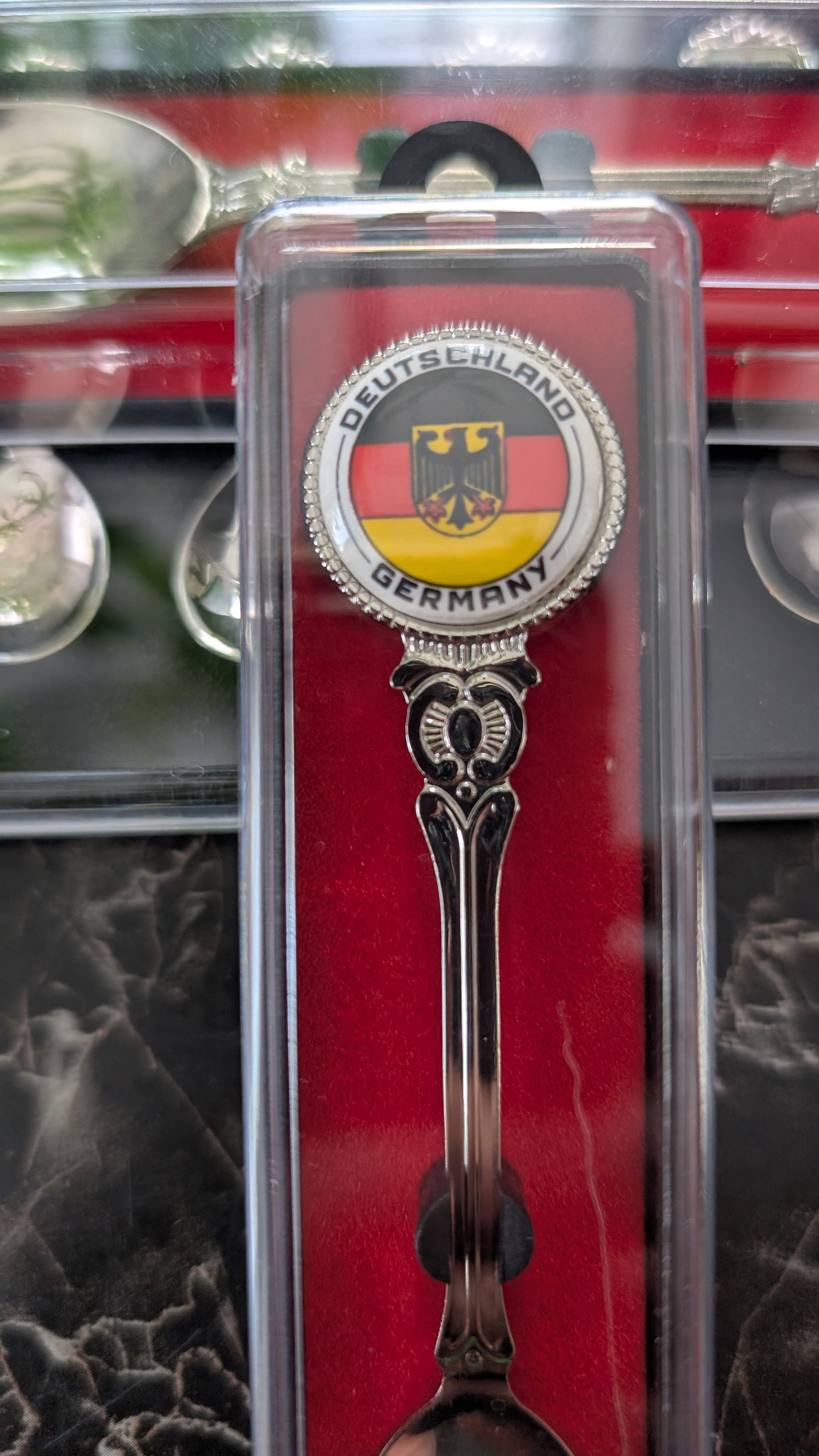 This decorative demitasse spoon comes in its original clear display case with red backing.
