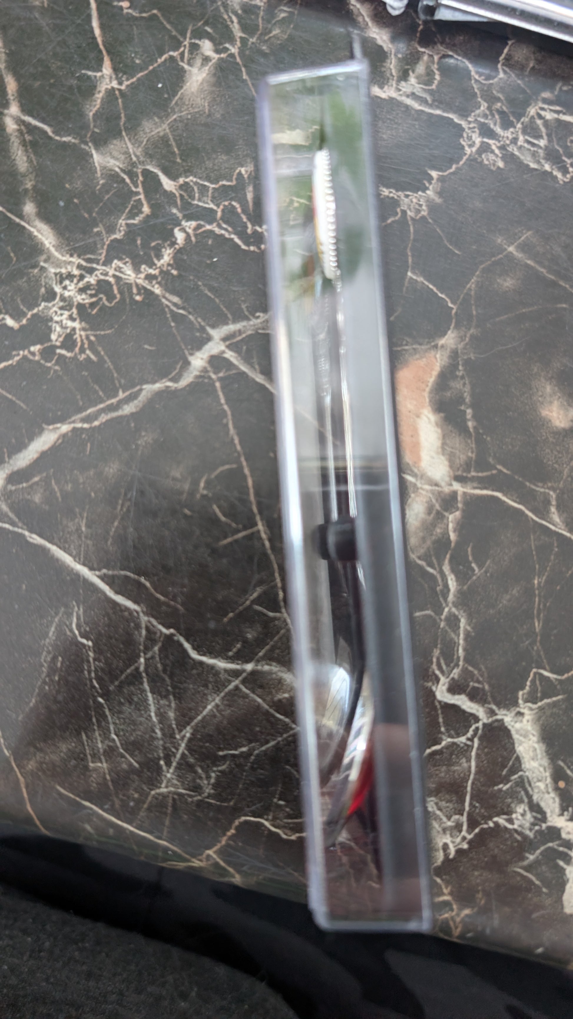 The original inner plastic clip that held the spoon in place inside the display case has broken. As a result, the spoon moves freely inside the case.