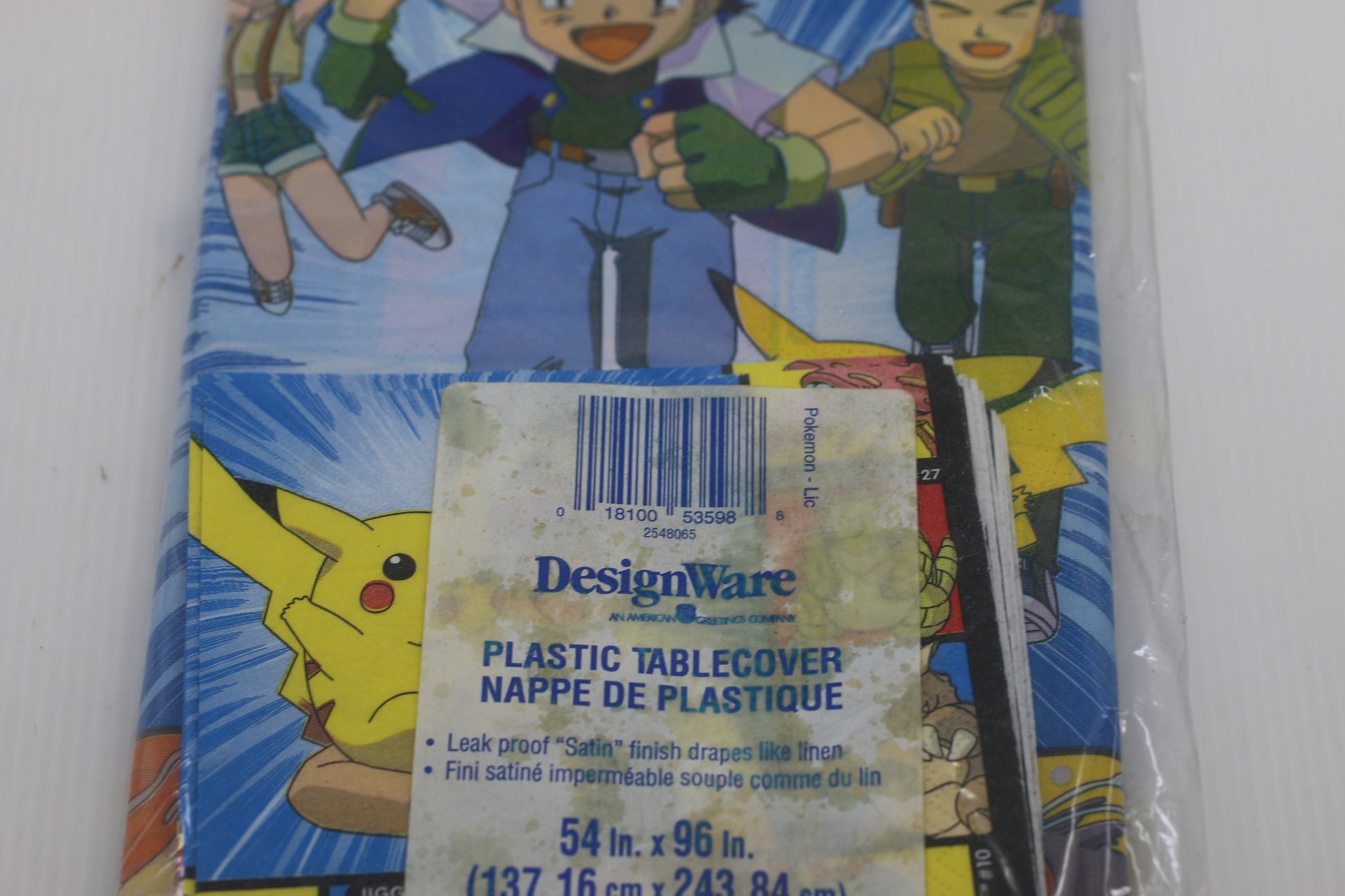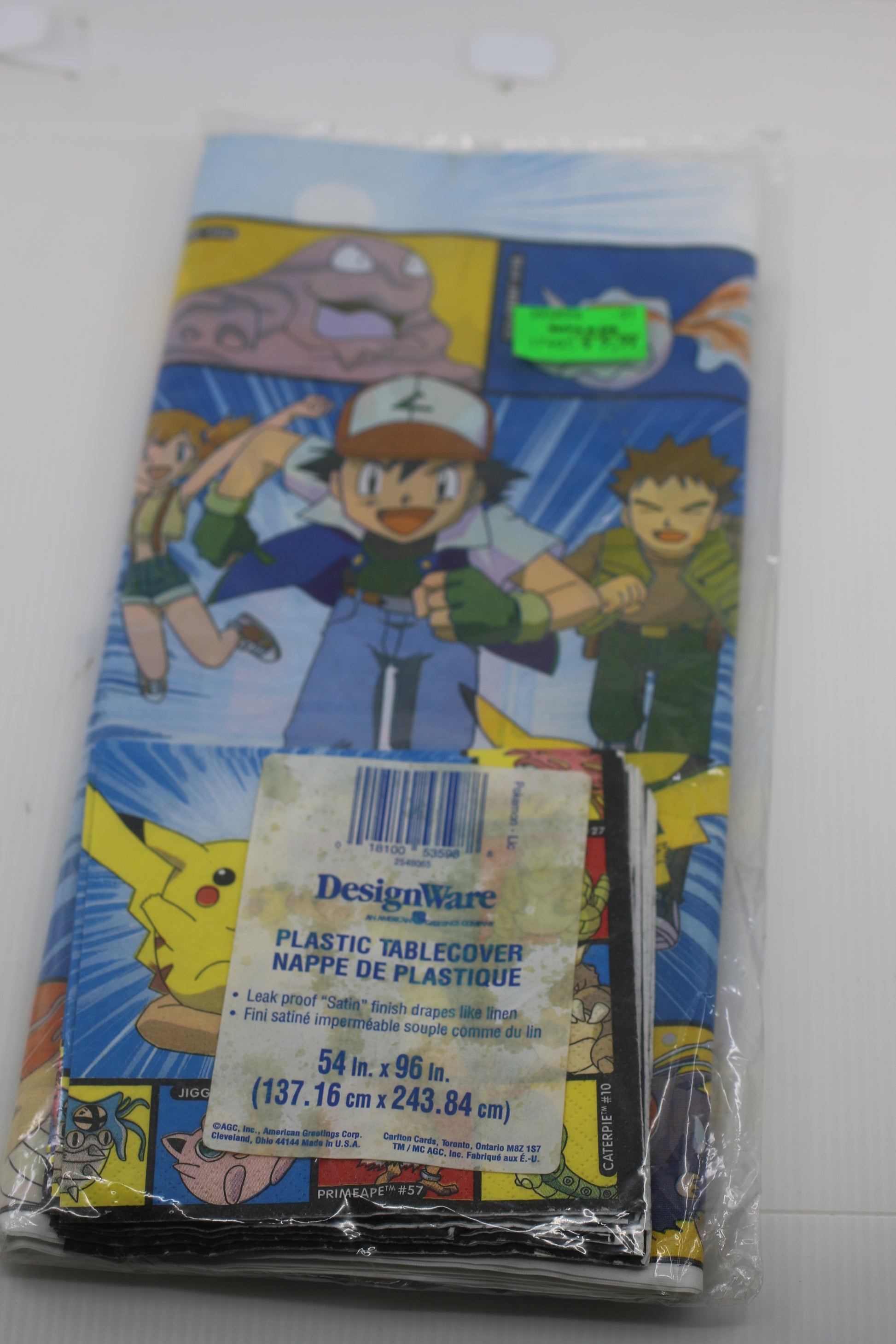 This is a vintage Designware plastic tablecloth featuring a multicolor Pokemon theme with Ash, Pikachu, and Team Rocket characters. It measures 54" x 96" and is perfect for a Pokemon-themed birthday party. The tablecloth is durable and can be reused for future events.