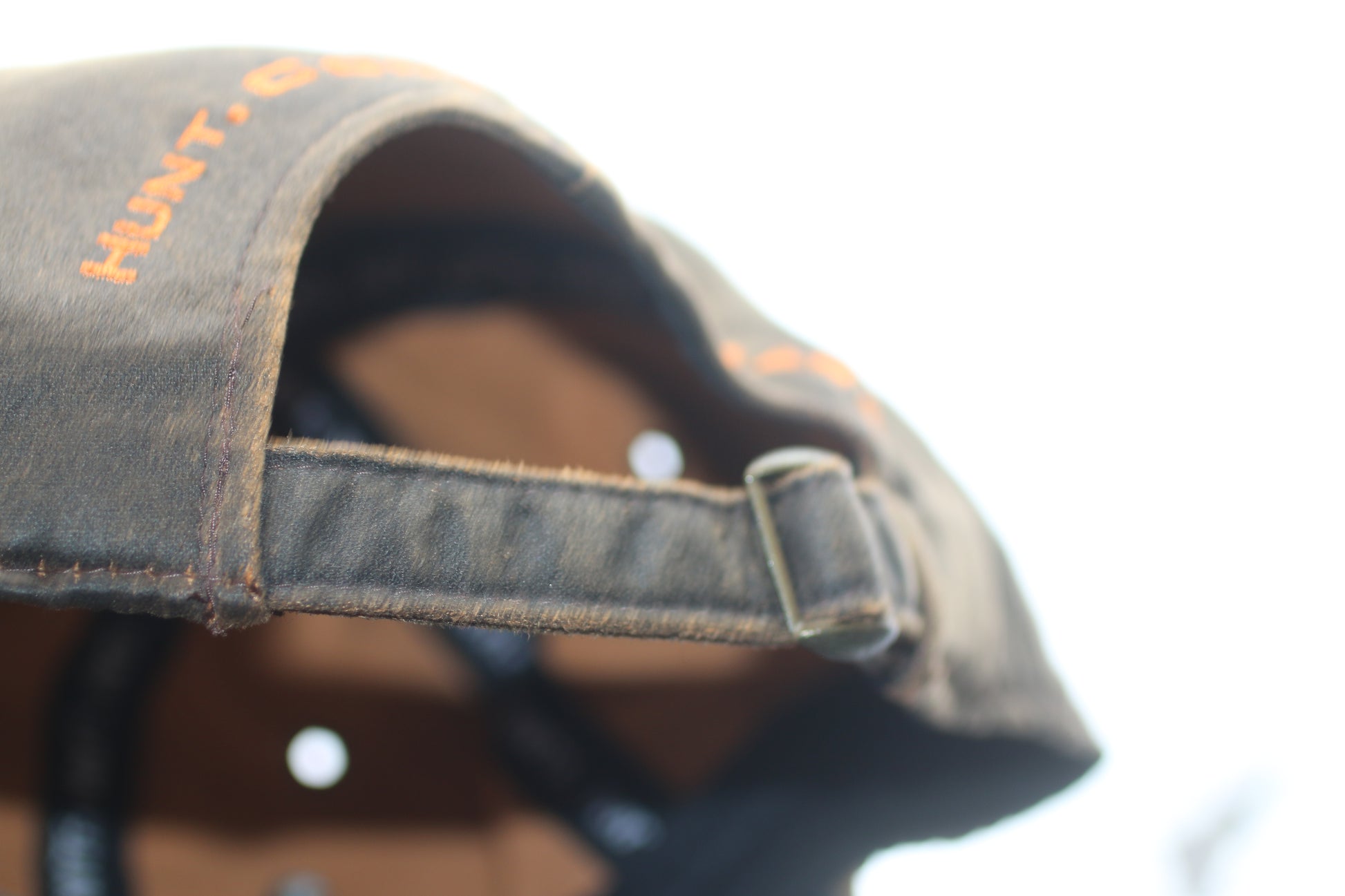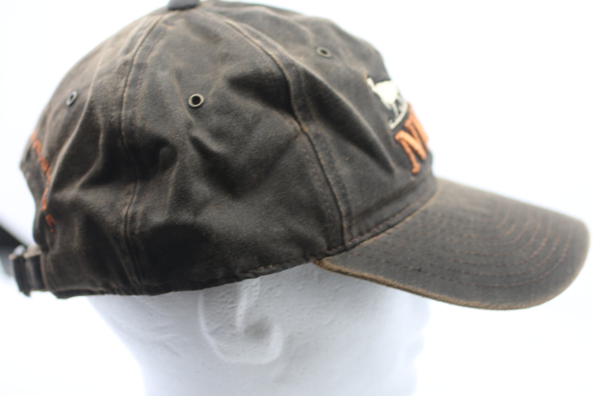 This cap shows a natural distressed finish, giving it an authentic outdoor and hunting look that collectors and outdoorsmen appreciate. The adjustable strap ensures a comfortable fit for most head sizes.