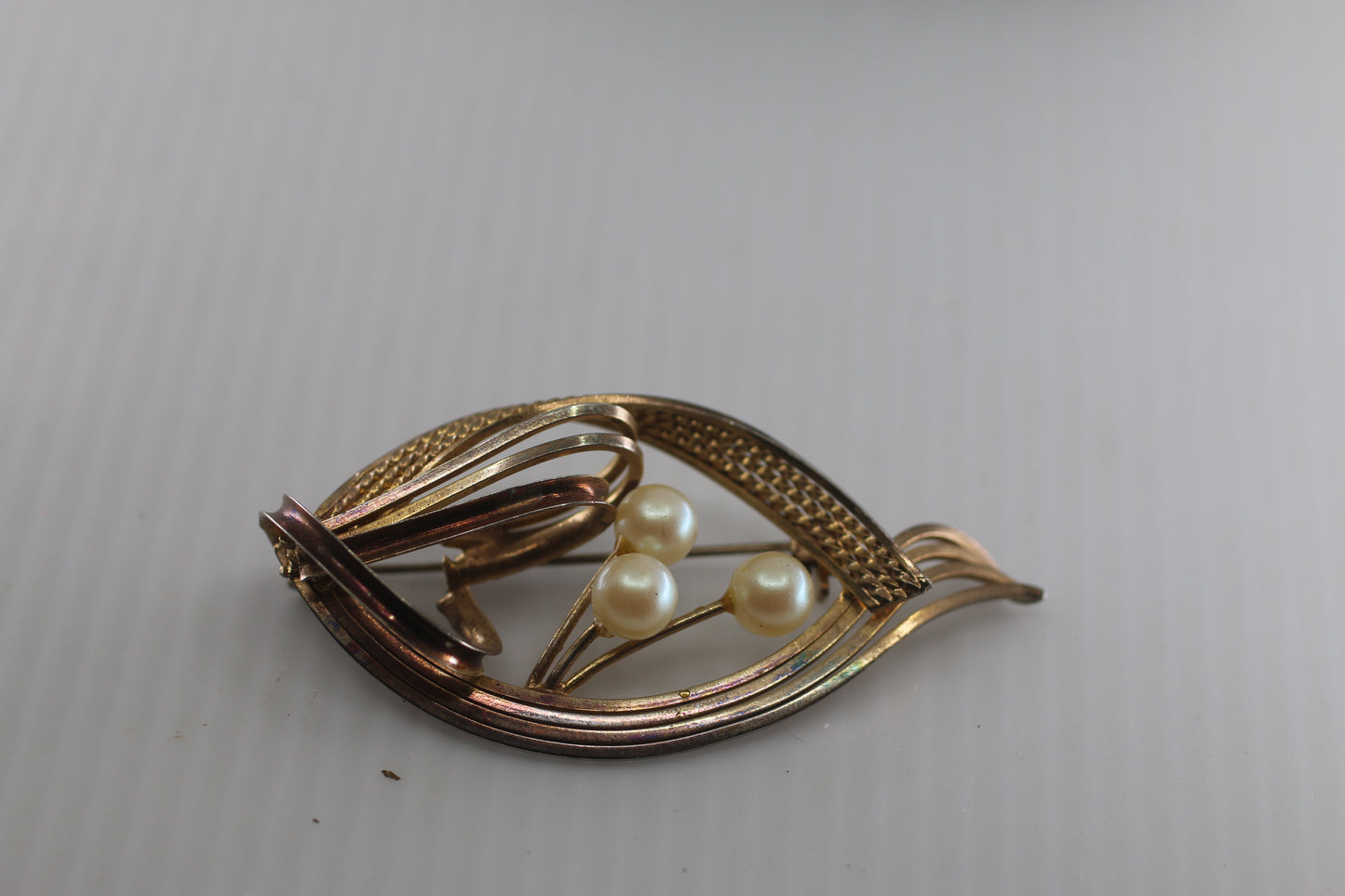 Elegant Vintage Creator Brooch - Golden tone Flower, faux Pearls 2"