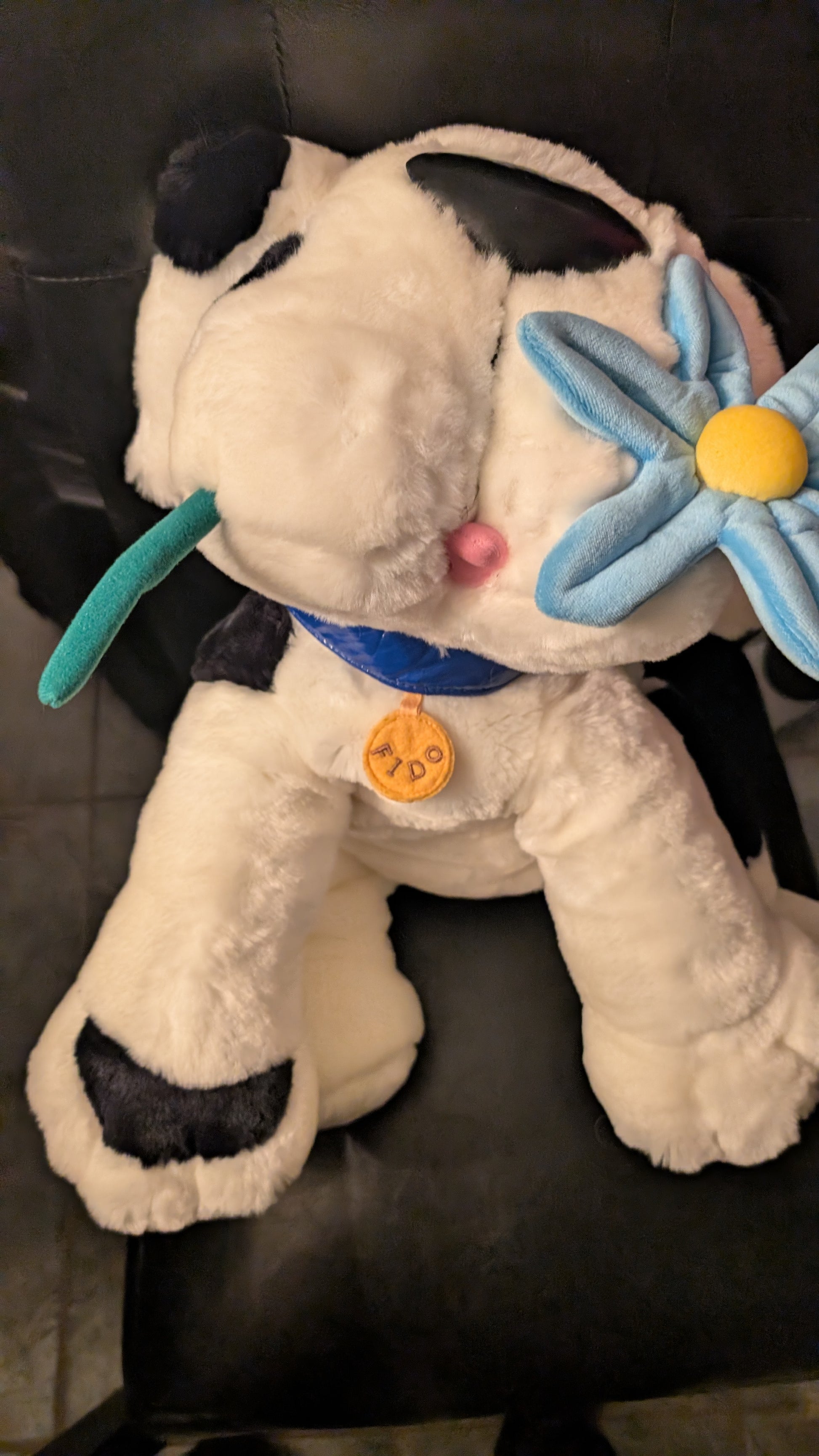 This charming plush features a white and black puppy holding a blue flower, wearing a collar with a “Fido” name tag, and includes the original attached green leash. A whimsical and nostalgic design typical of early-2000s gift plush.