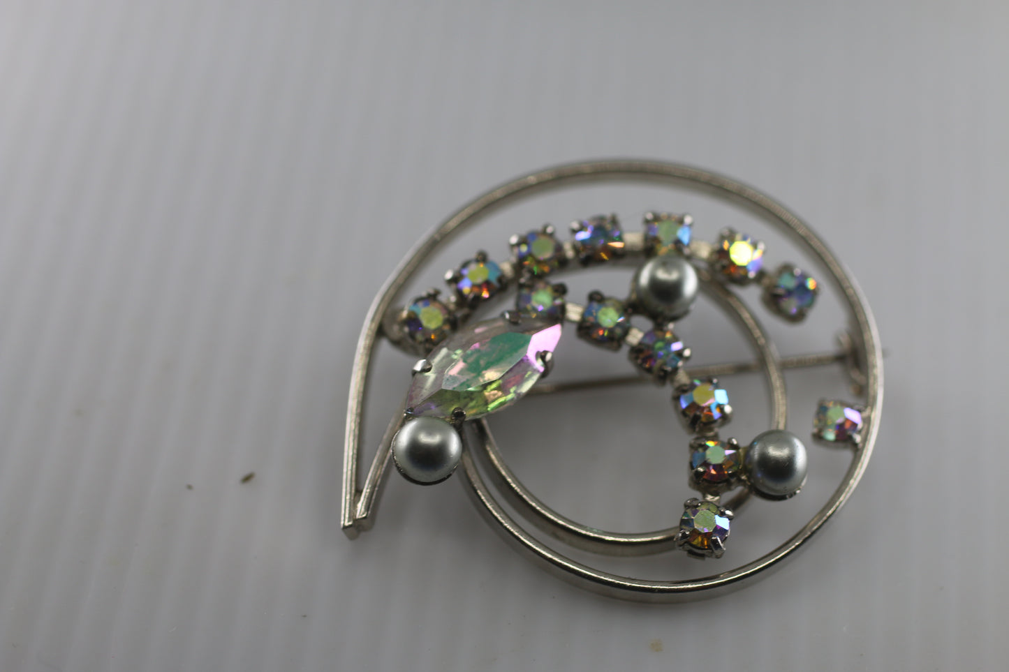 Vintage Sherman Brooch Topaz & silver tone Aurora Borealis style Rhinestone
