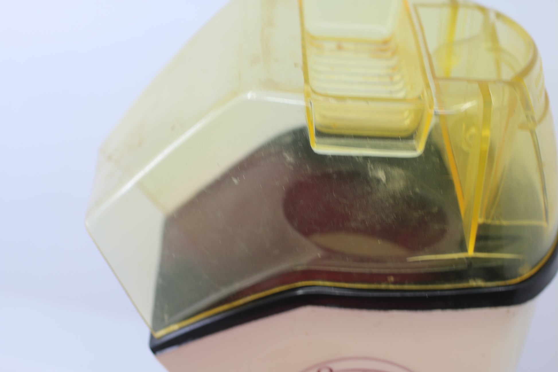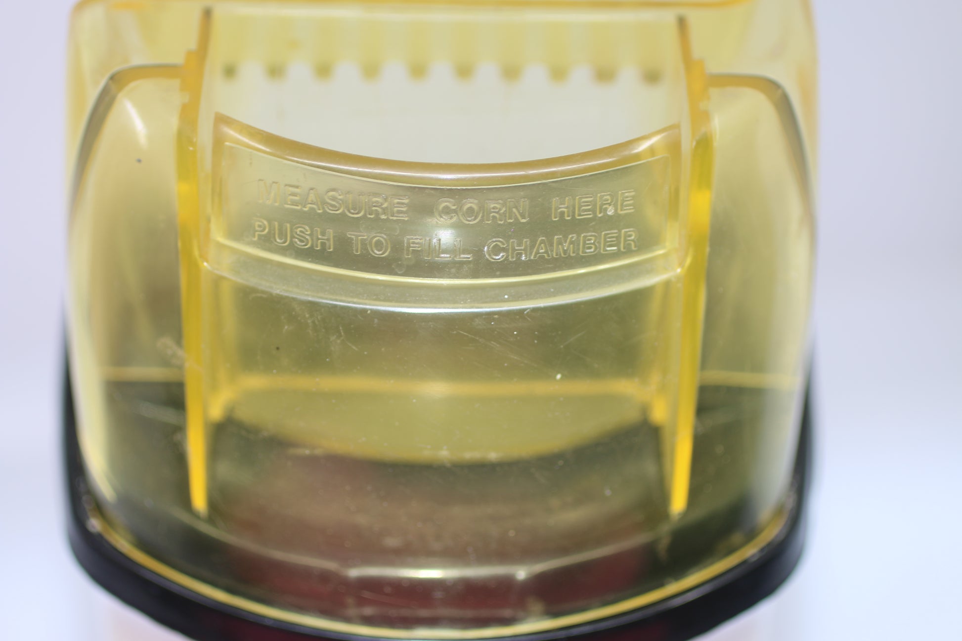 Authentic vintage Sunbeam popcorn popper, model PM-1, classic retro countertop electric popcorn machine. Features the original clear yellow plastic hood with measuring chamber (“Measure corn here – push to fill chamber”) and iconic Sunbeam popcorn cart logo.