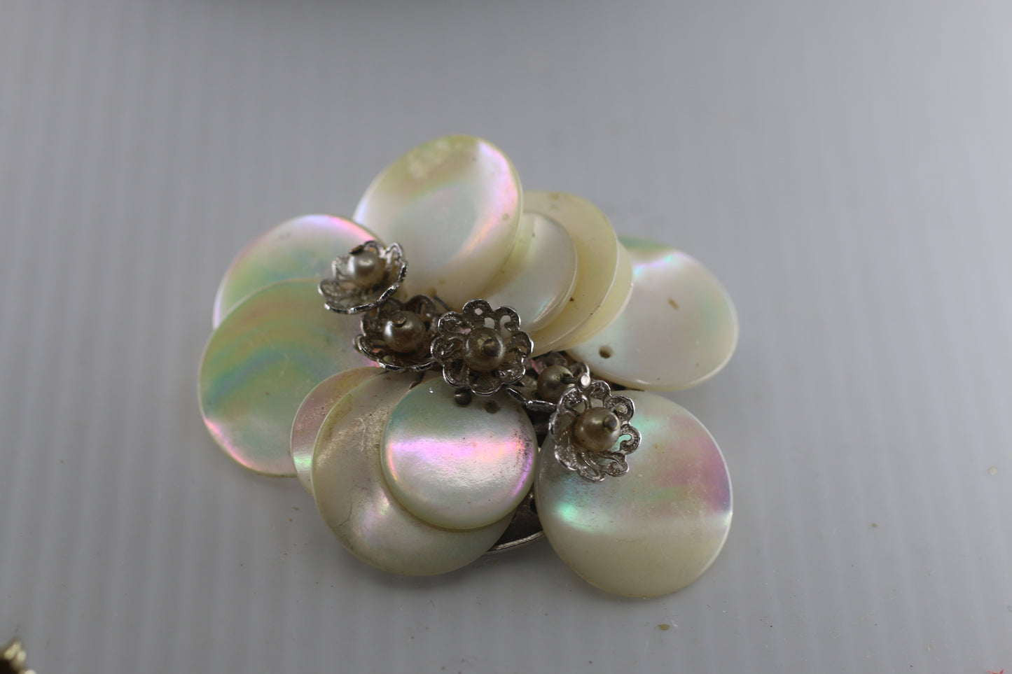 Mop Flower Crystal Faux Pearls Brooch/Pin Vintage Hand Made Jewelry