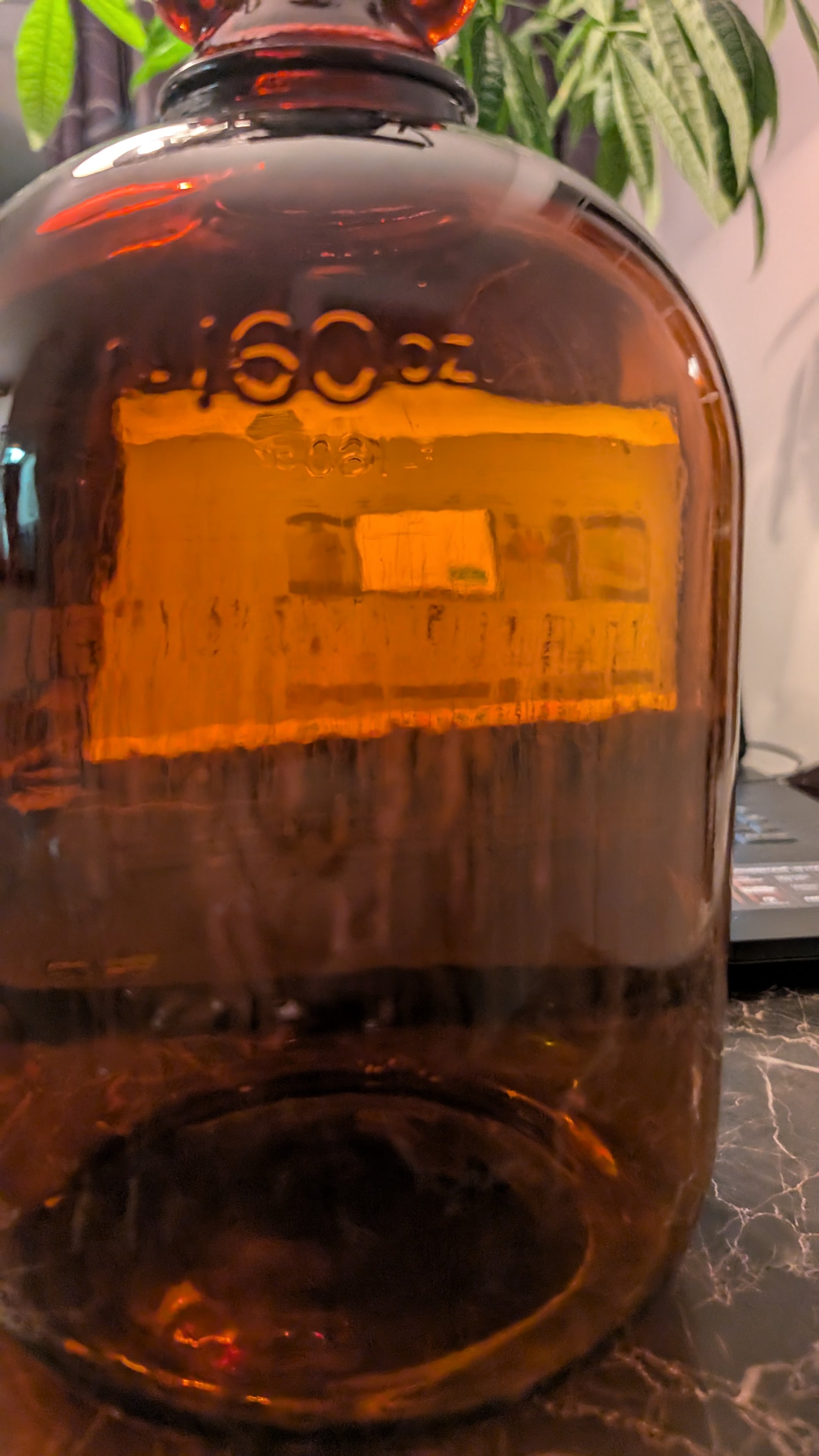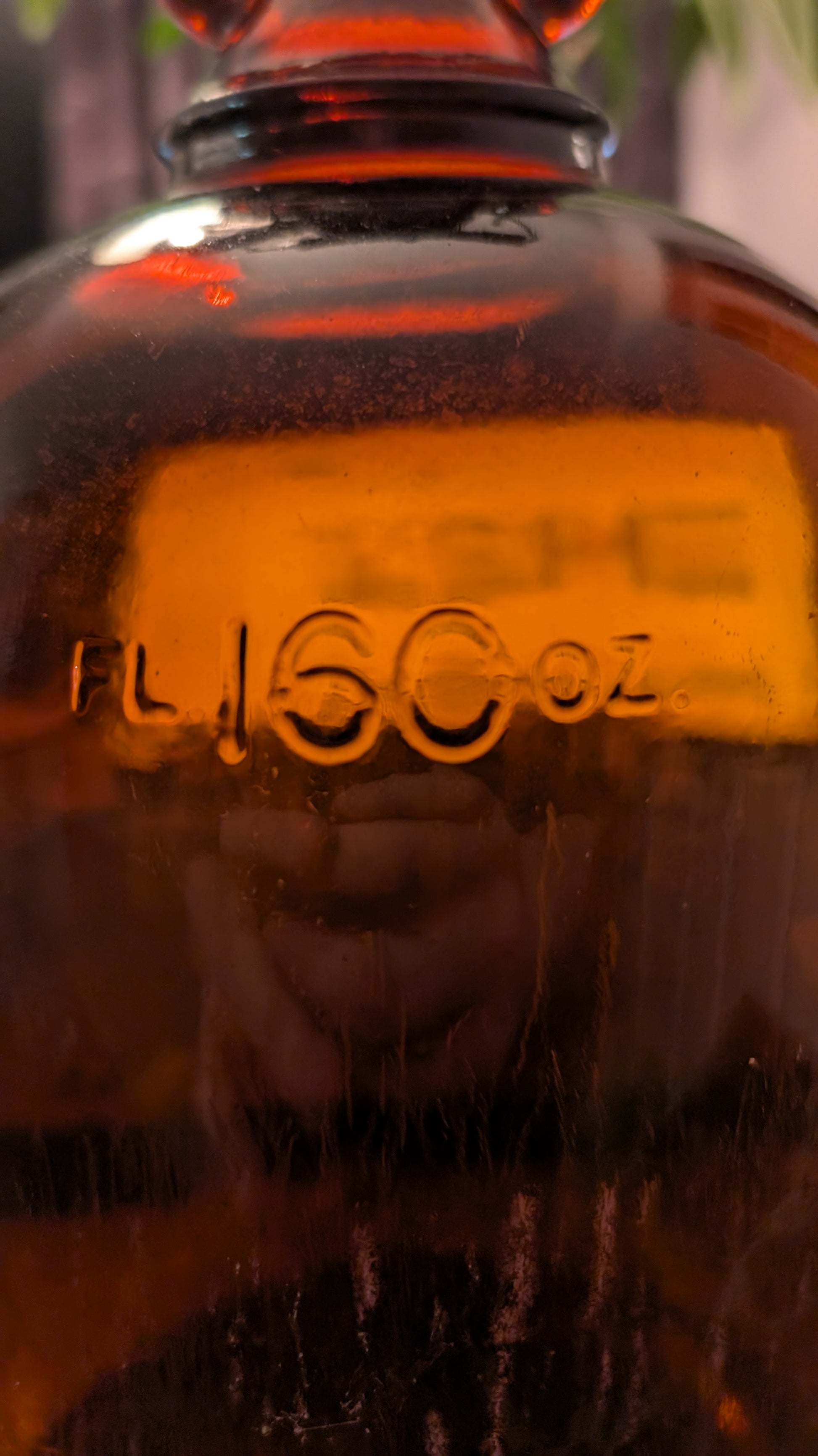 Vintage amber (brown) glass jug marked 160 oz, Made in Canada.