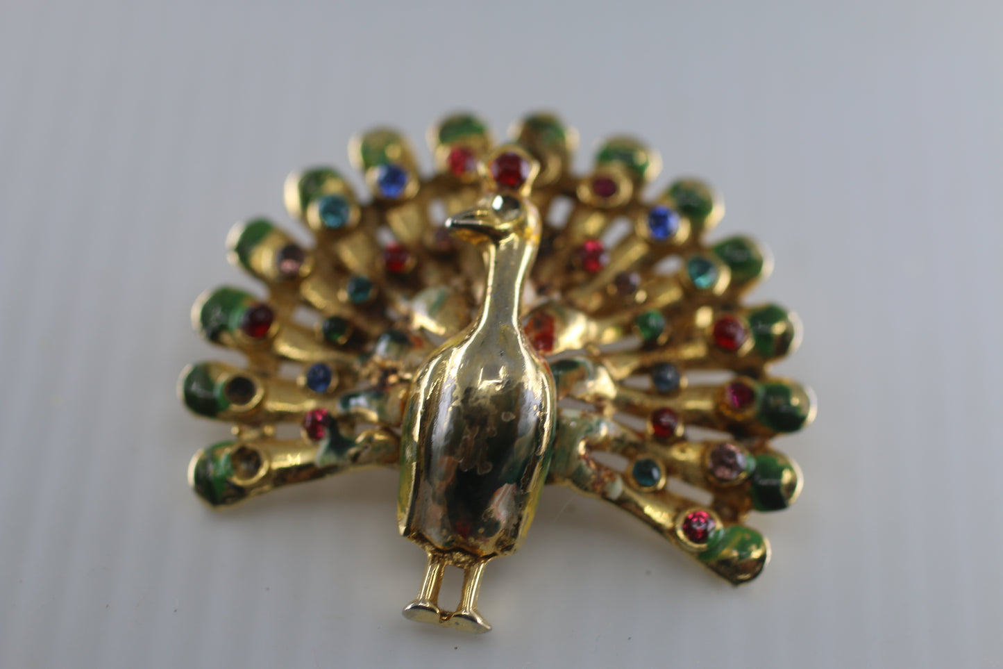 Peacock Brooch Pin Gold Tone Multicolor Rhinestone Fanned Out Feathers Pose