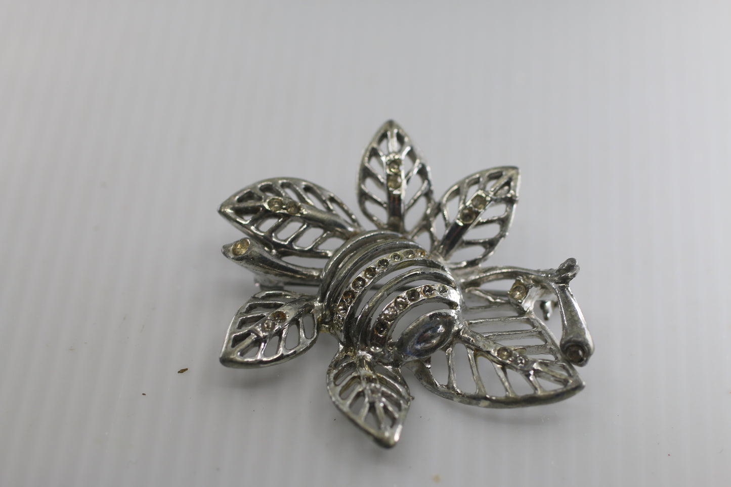 Vintage Sterling Silver tone Rhinestone Leaf Design Fur Clip Brooch