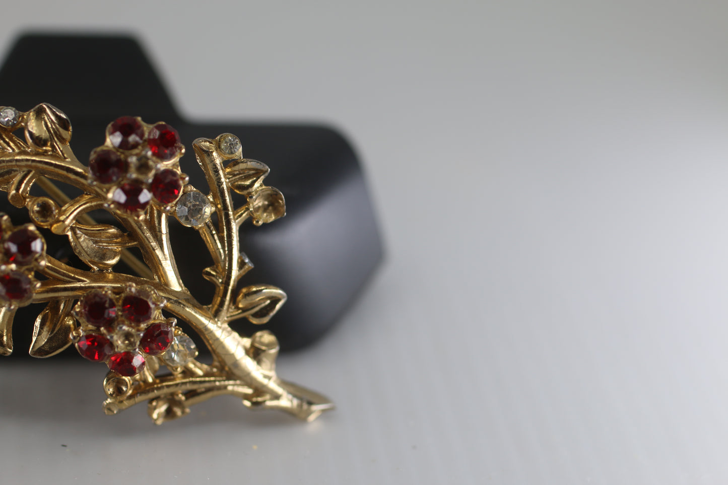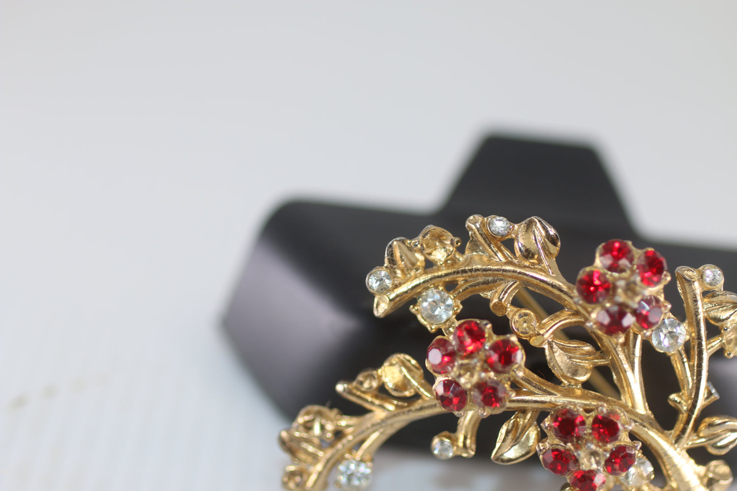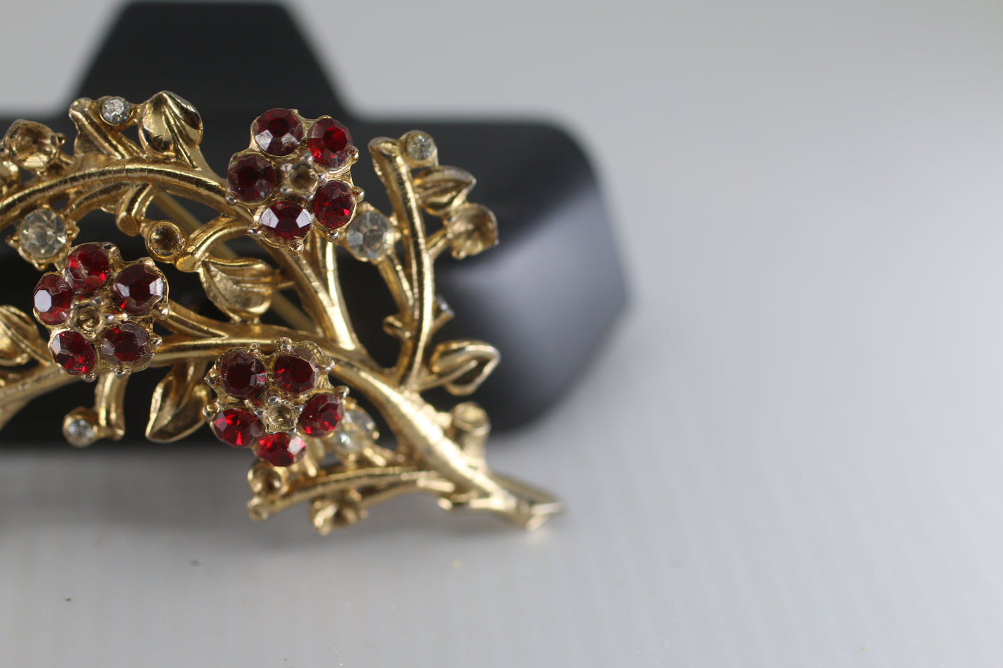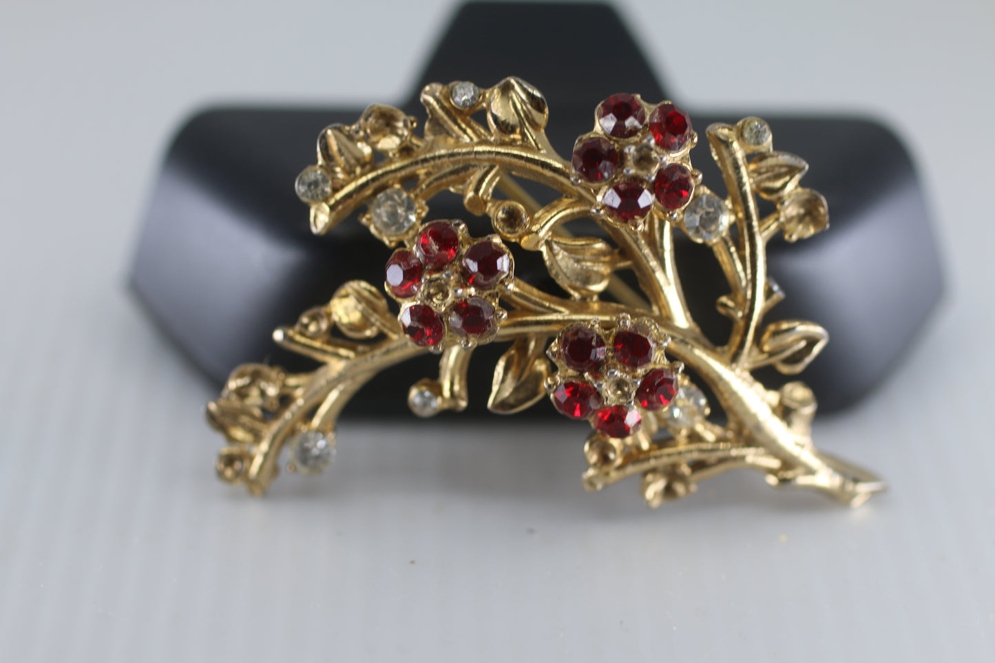 Ruby Red Rhinestone Brooch Floral Bouquet Accented w/ Faux Tone Vtg