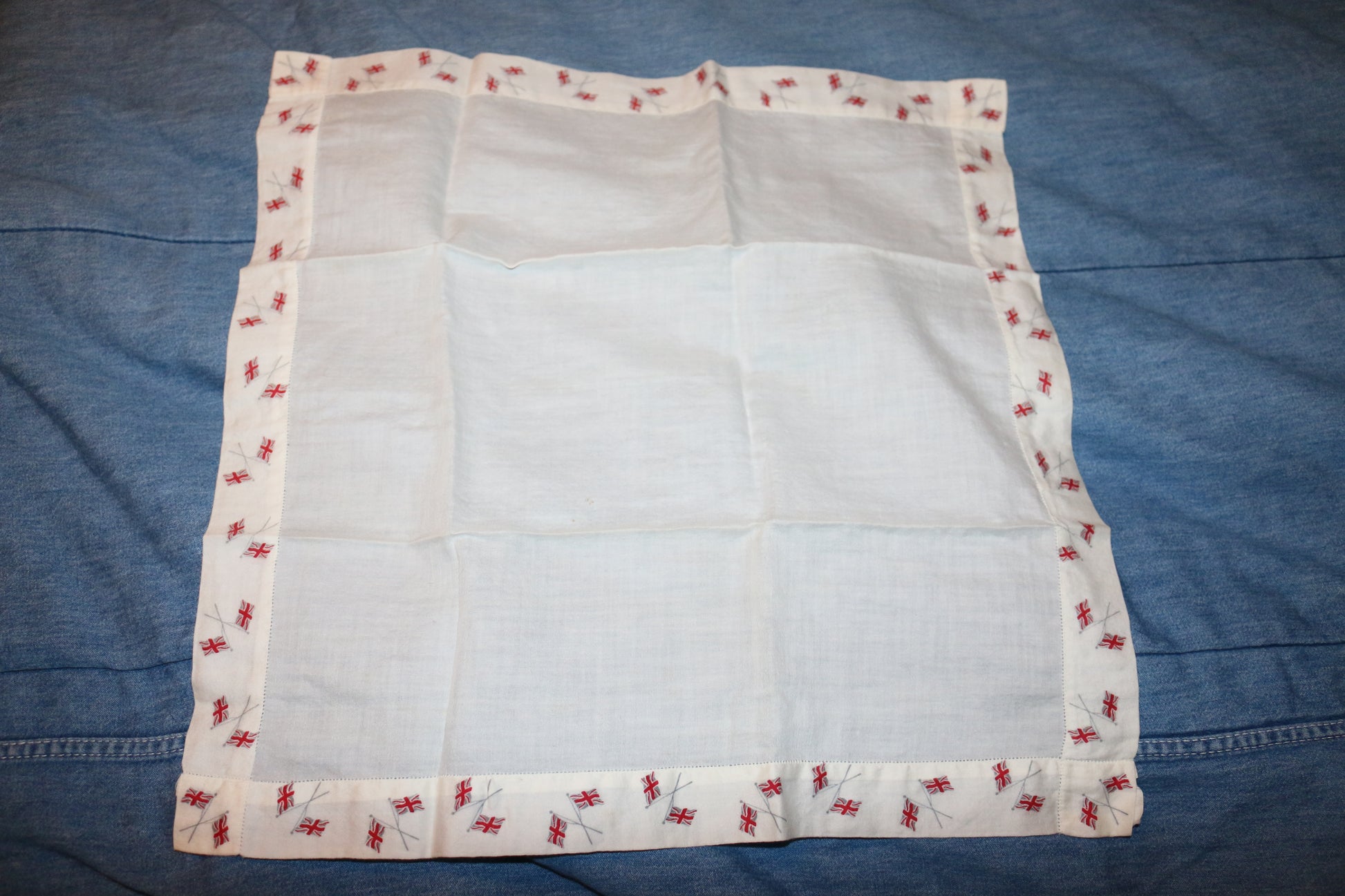 Vintage white cotton handkerchief featuring a red cross stitch–style border. Unbranded and likely dating from the mid-20th century.