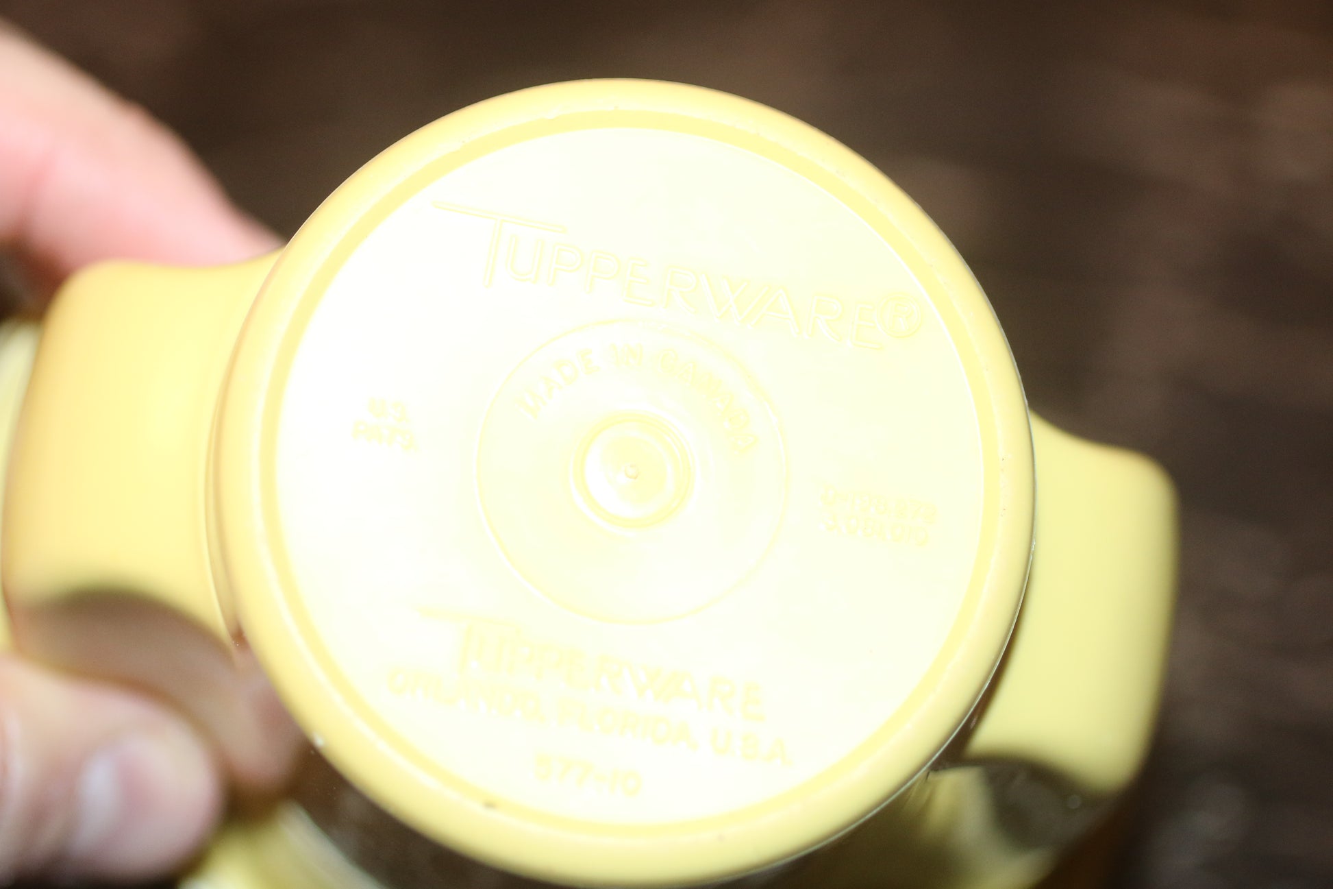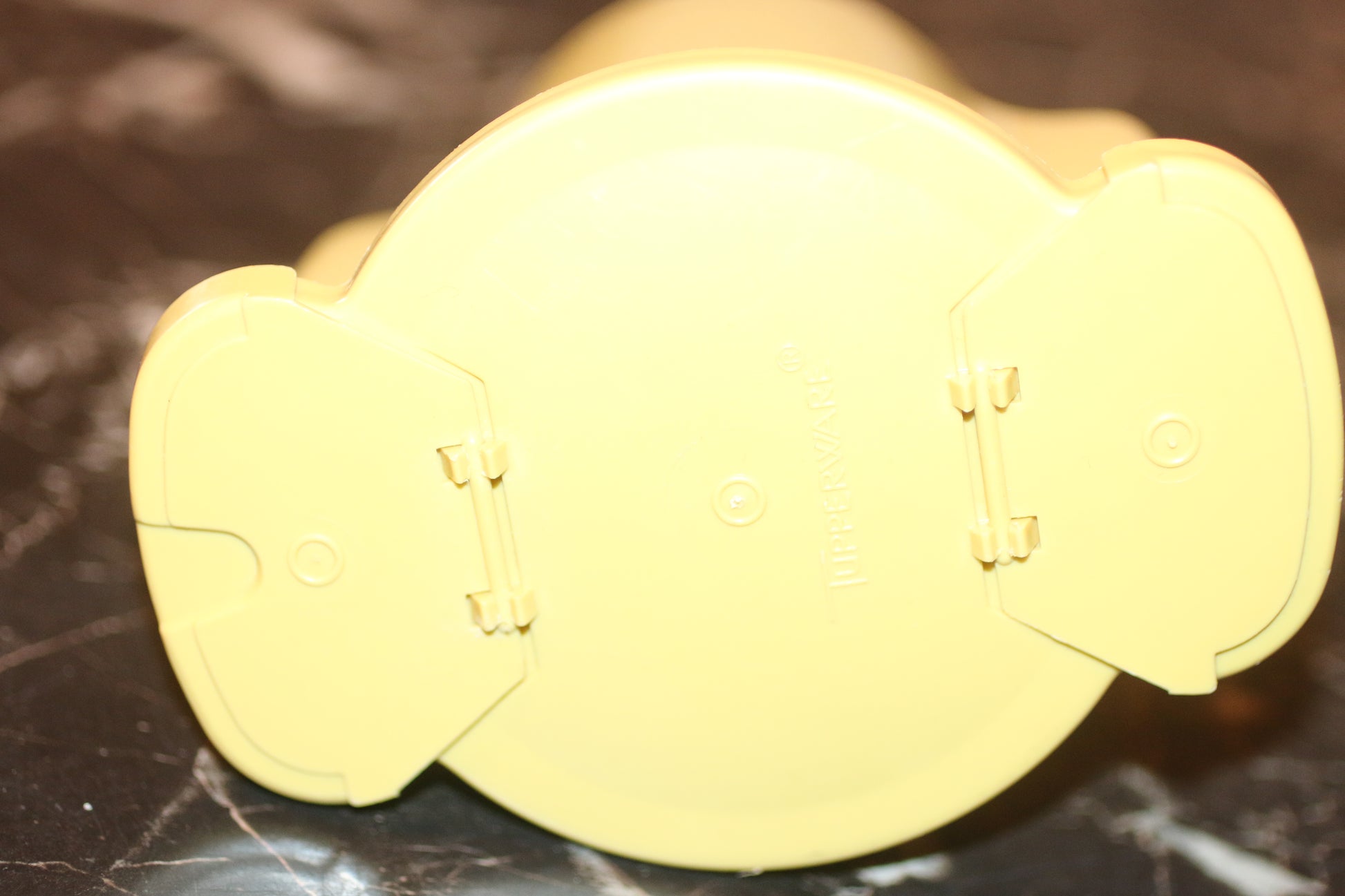 Authentic 1970s Tupperware flip-open dispenser, finished in the unmistakable Harvest Gold color — a true icon of mid-century and retro kitchen design.