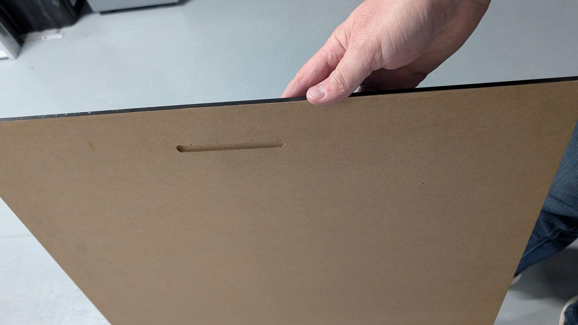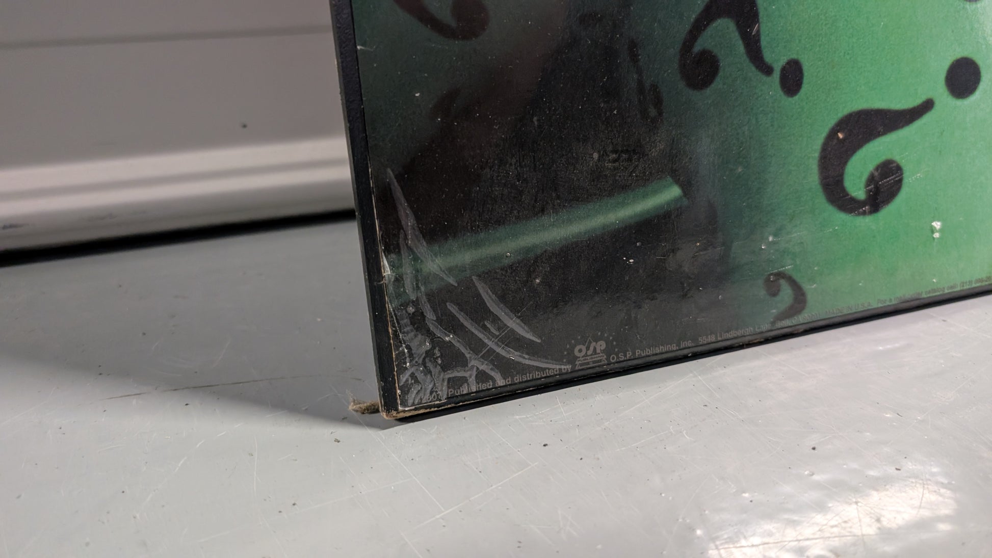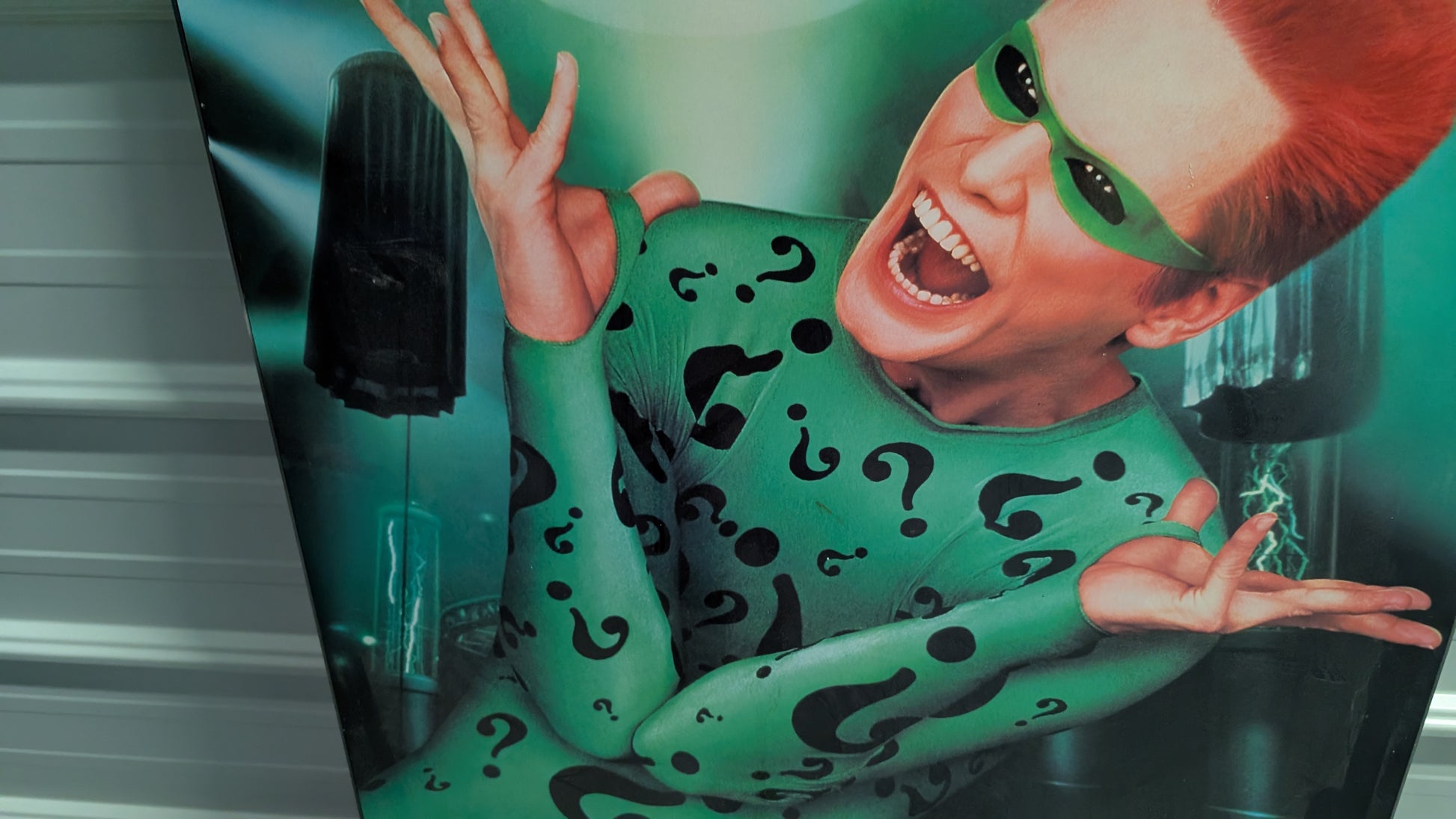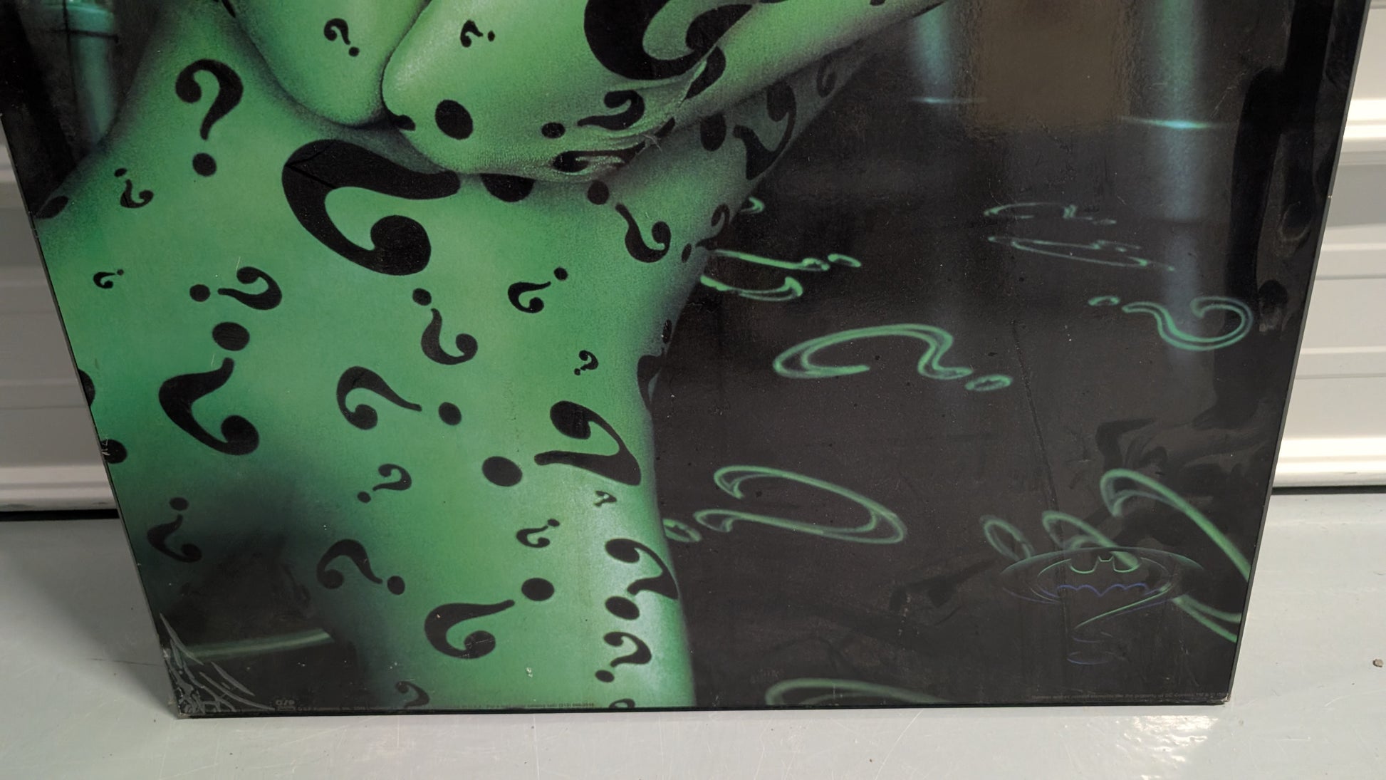 Large vintage wall art featuring The Riddler (Jim Carrey) from Batman Forever. Printed on rigid pressed wood / MDF board with glossy laminated front surface and black edge trim.