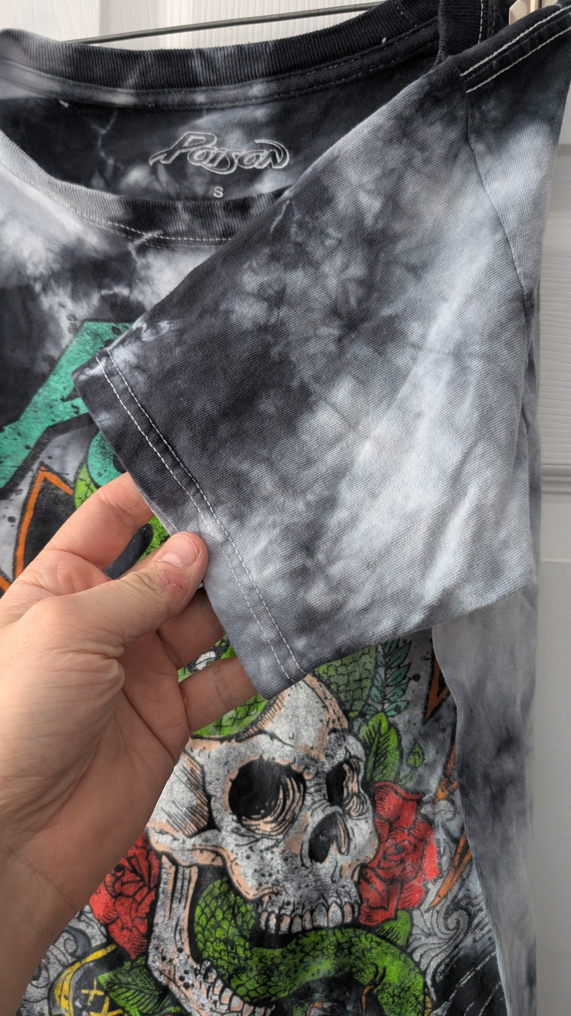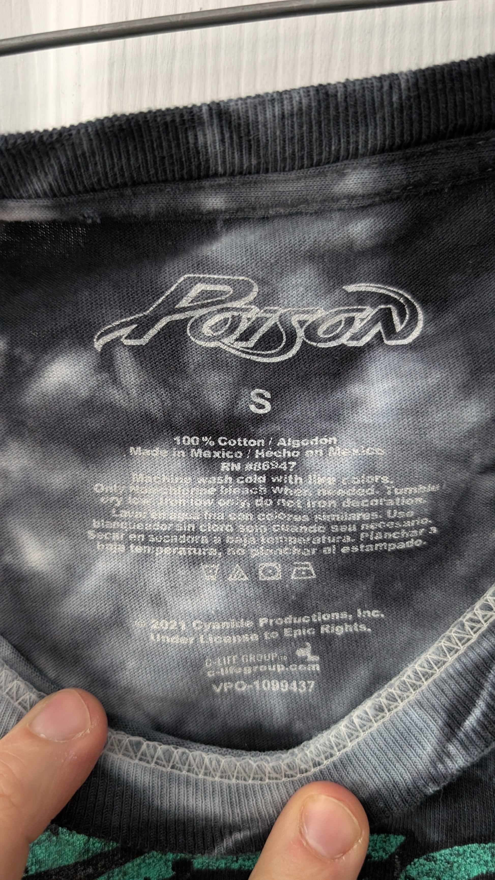 Official Poison band T-shirt featuring skull and snake graphic on a black/grey tie-dye background. Printed on a Poison-branded tag, size Adult Small, 100% cotton.