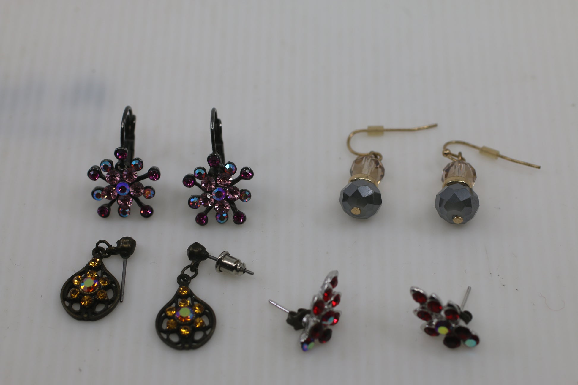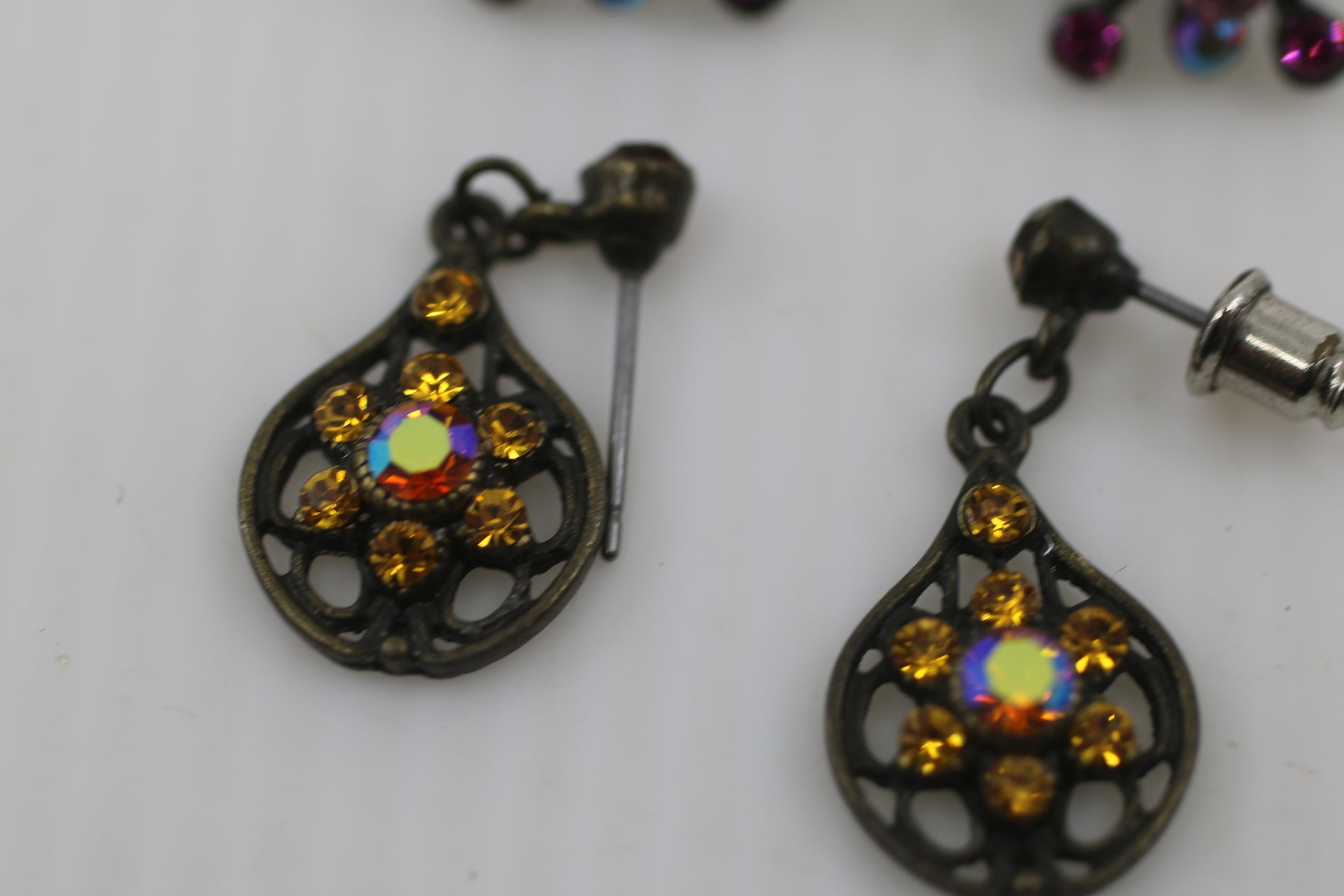 This listing is for a small mixed lot of vintage costume earrings, featuring multiple styles, colors, and materials. The set includes drop earrings, stud earrings, and lever-back styles, decorated with rhinestones and faceted crystal beads.