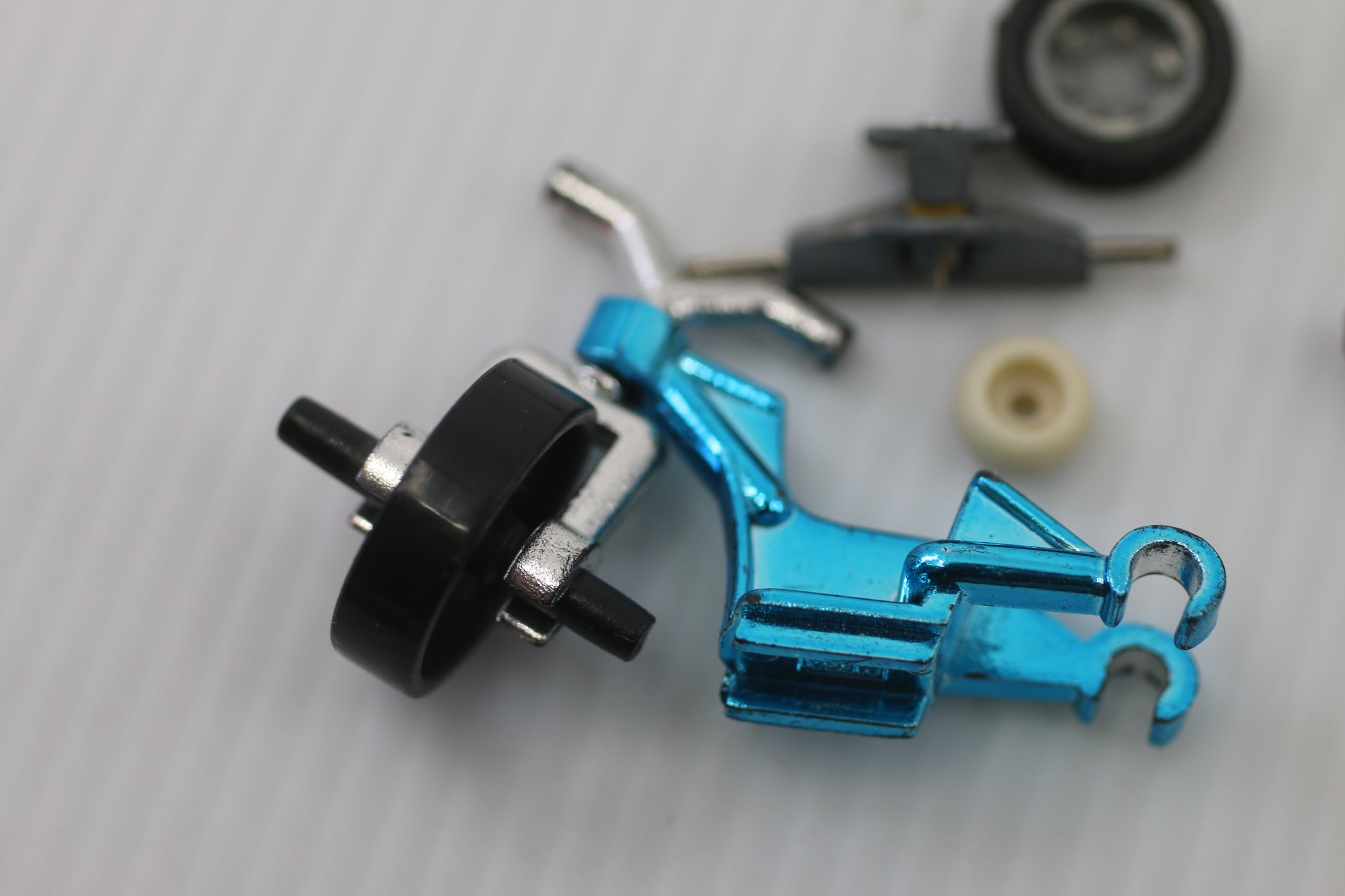 Assorted loose parts: wheels, trucks, screws, bushings, axles, tools, and accessories