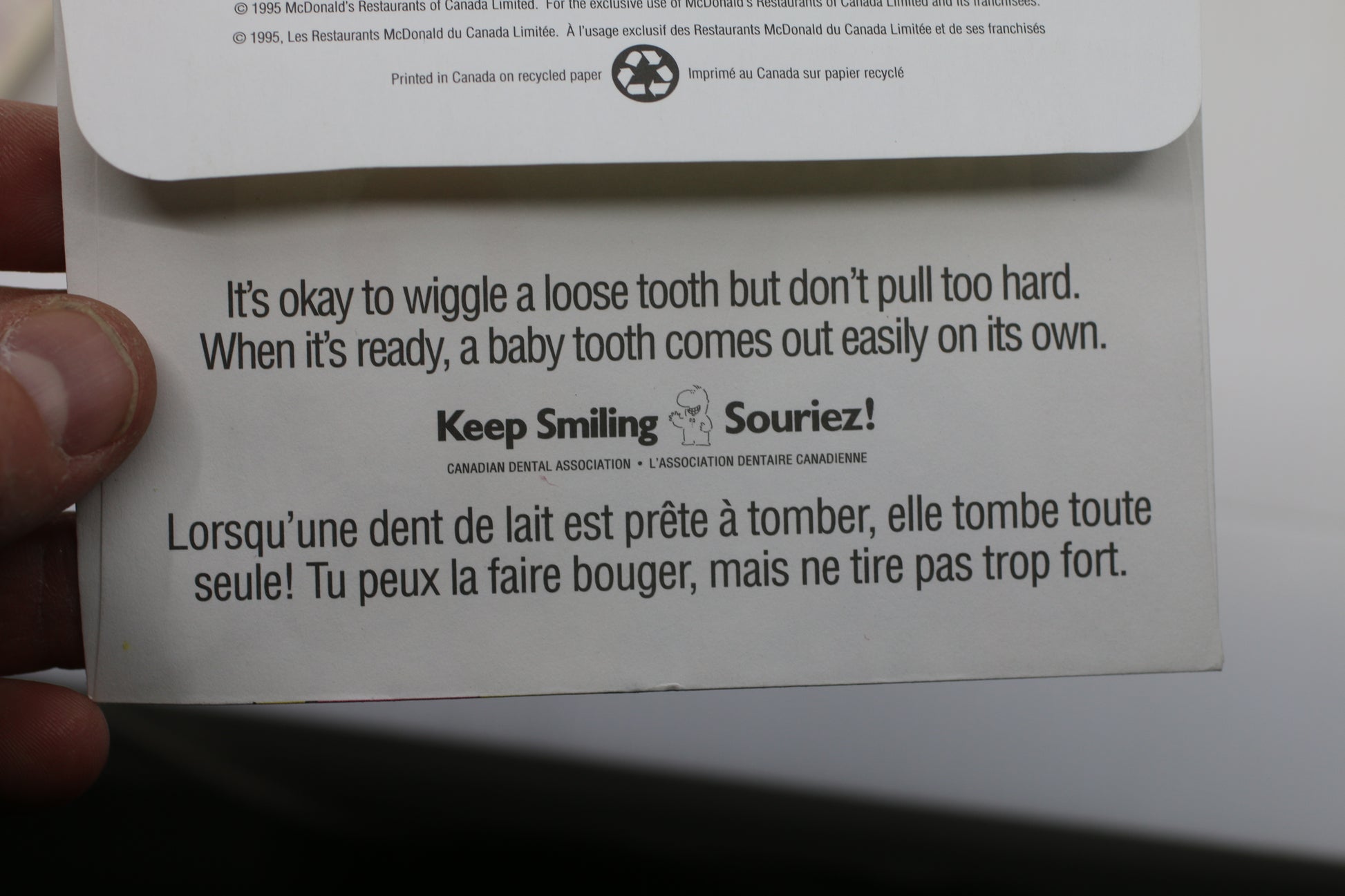 Features Ronald McDonald, Grimace and McDonaldland characters with bilingual English/French educational message about baby teeth.