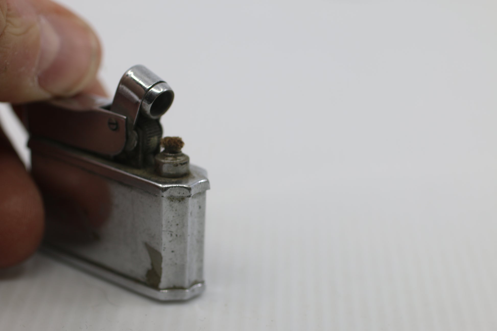 The lighter shows authentic age-related wear, including surface scratches, oxidation, and patina consistent with decades of use. Wick appears burnt and the lighter will require servicing (wick/flint/fuel) before use. Sold as-is, untested.