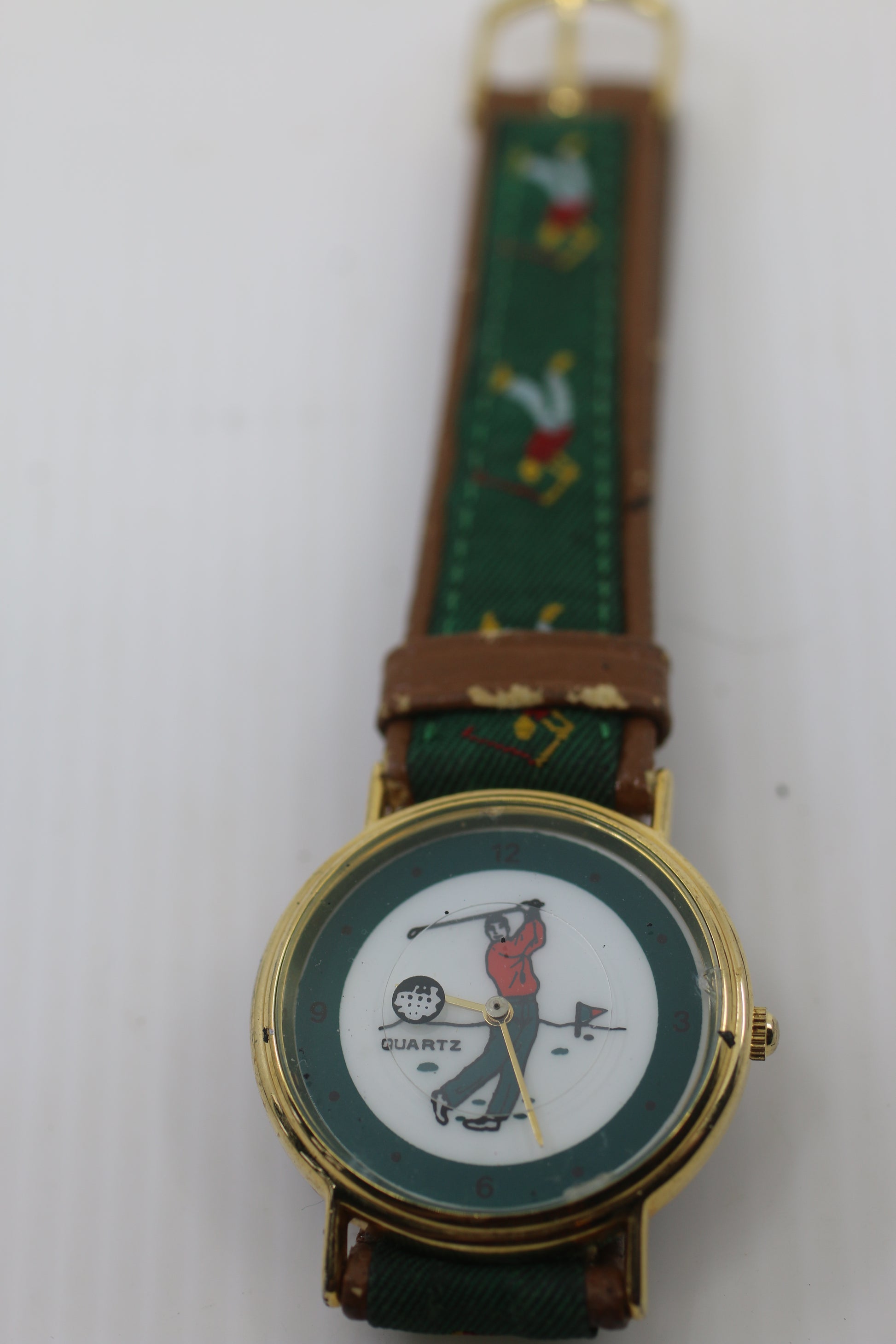 The watch has a gold-tone case, quartz movement, and a genuine leather strap with green fabric inlay decorated with golf motifs.