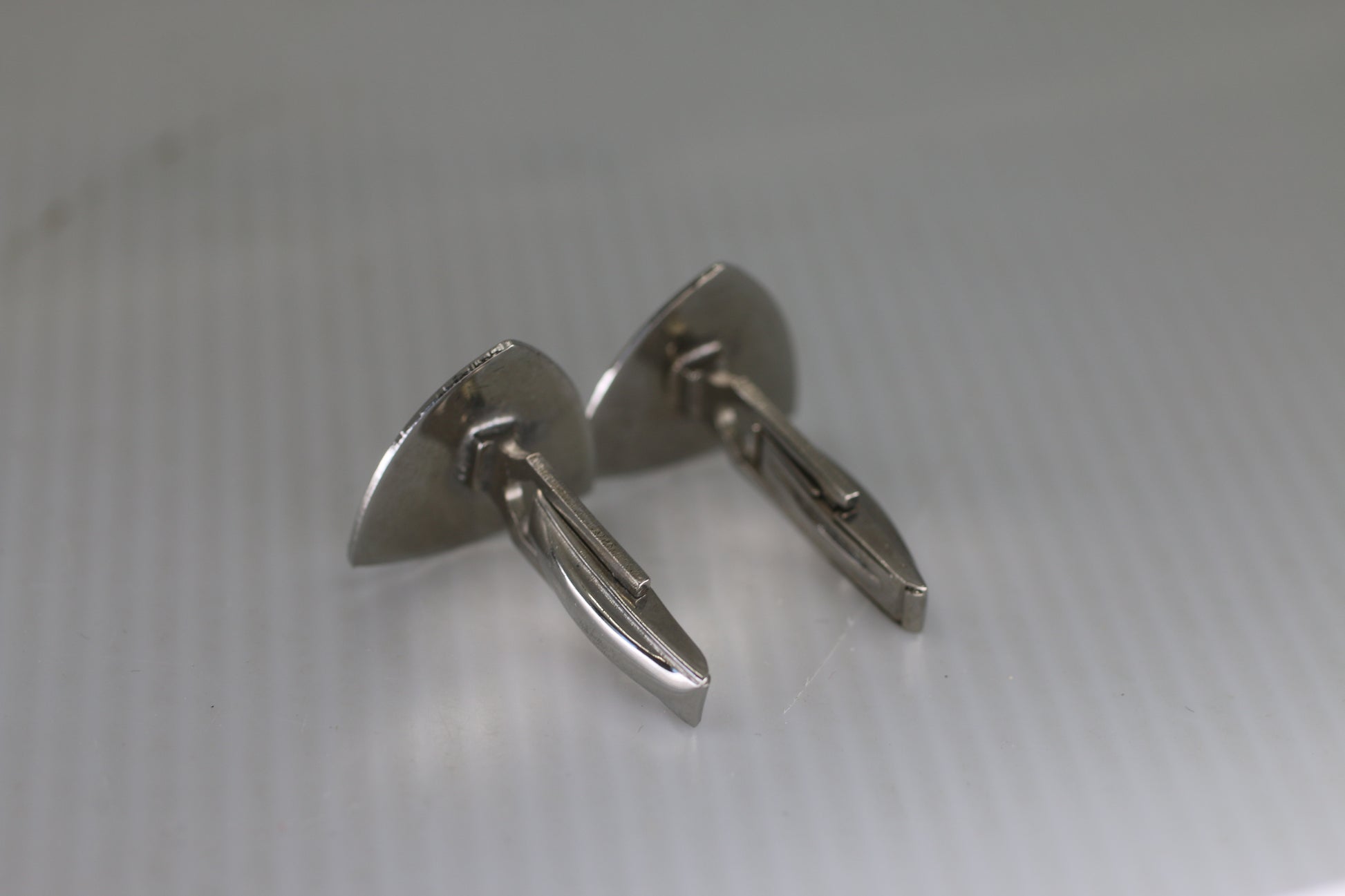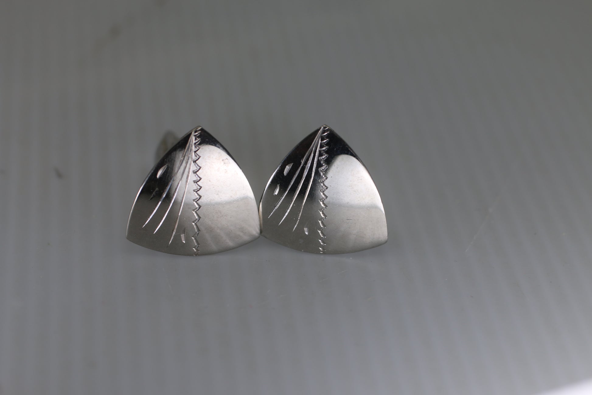 Pair of vintage silver-tone cufflinks featuring a sculpted, geometric mid-century modern design. The fronts have a bold, angular form with etched detailing that catches the light nicely.