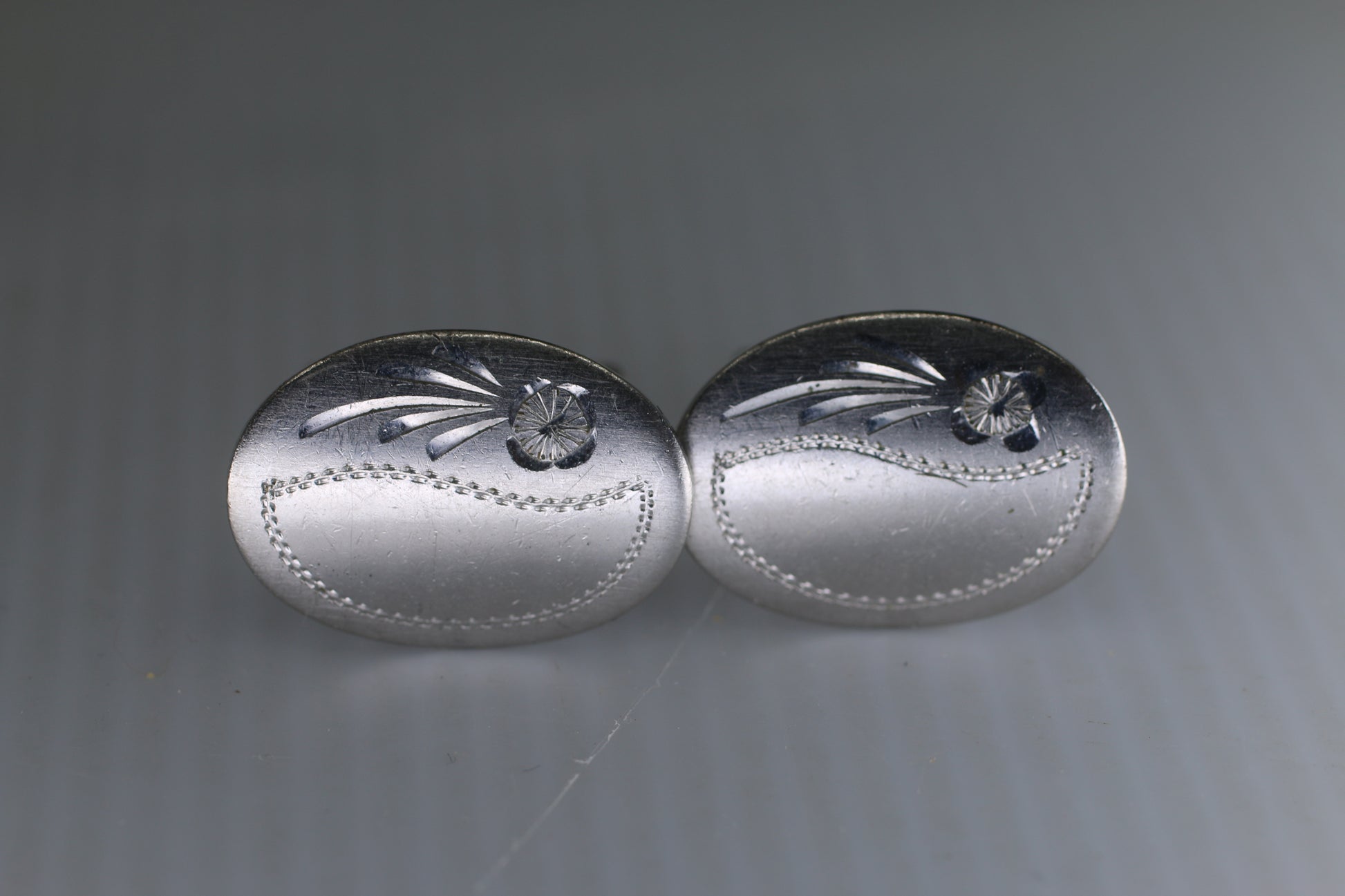 Elegant pair of vintage cufflinks featuring an oval silver-tone face with engraved decorative detailing.