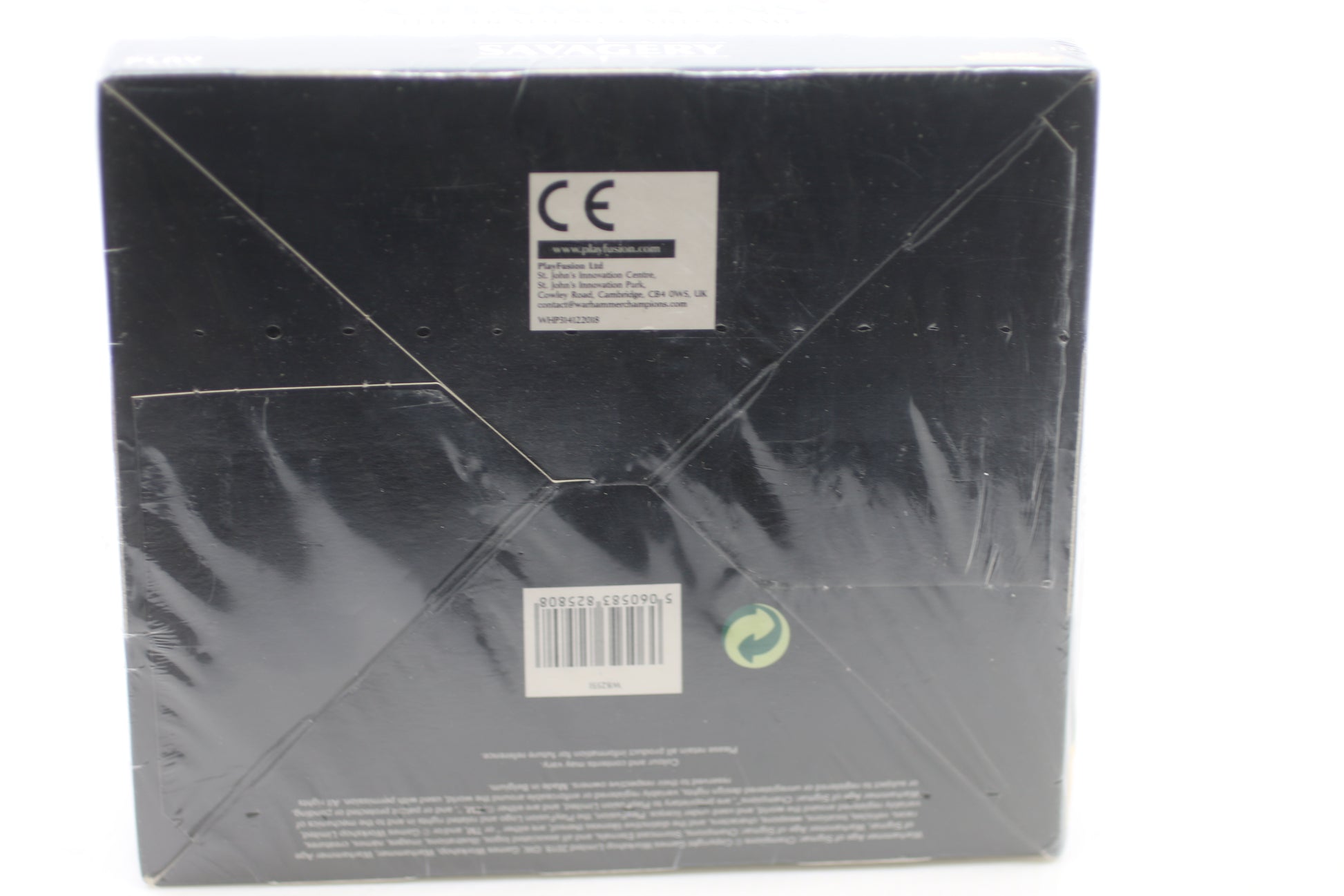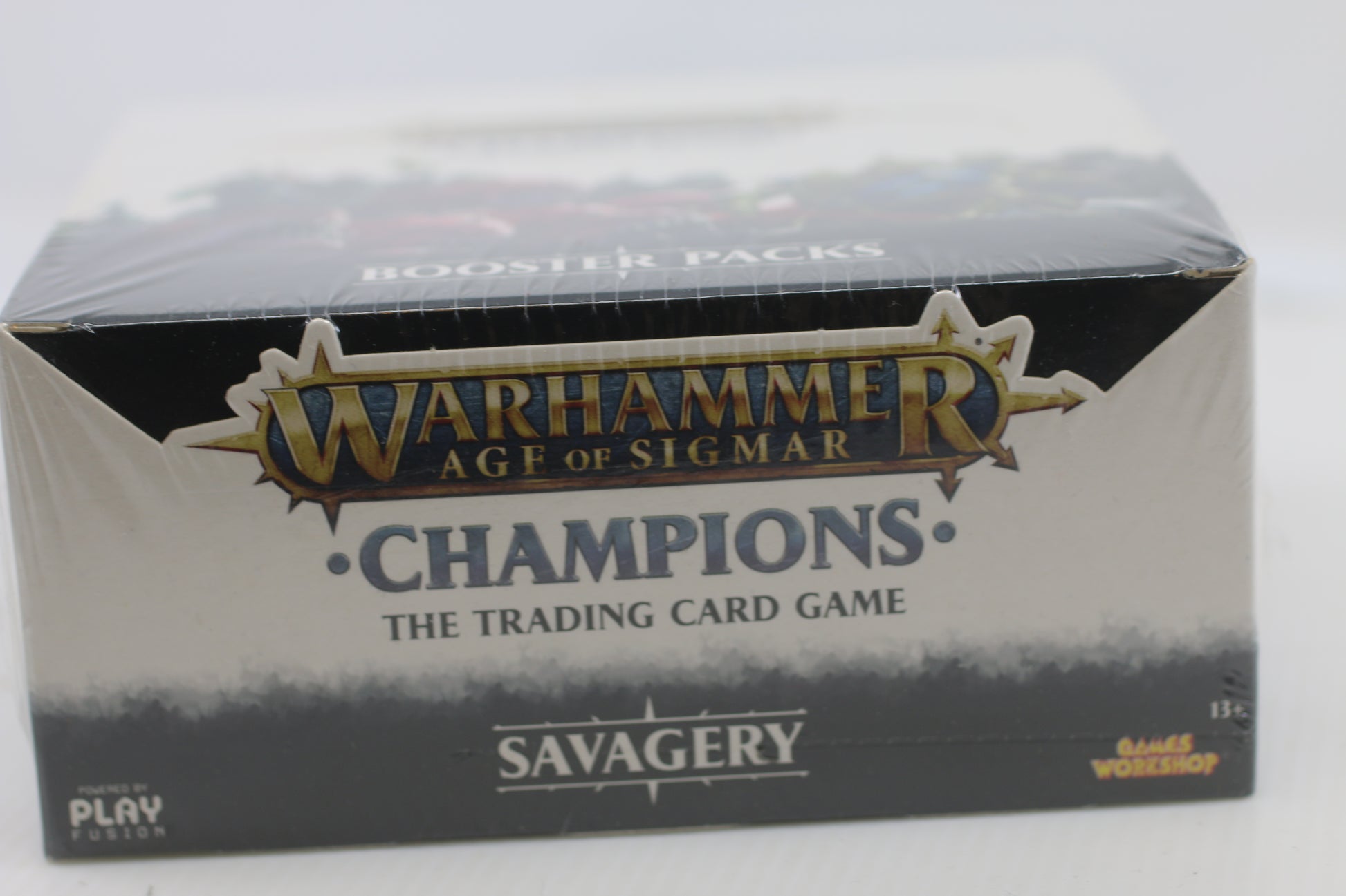 This is a sealed booster box containing 24 packs from the Warhammer Age of Sigmar: Savagery Trading Card Game, produced by Games Workshop in collaboration with Play Fusion.