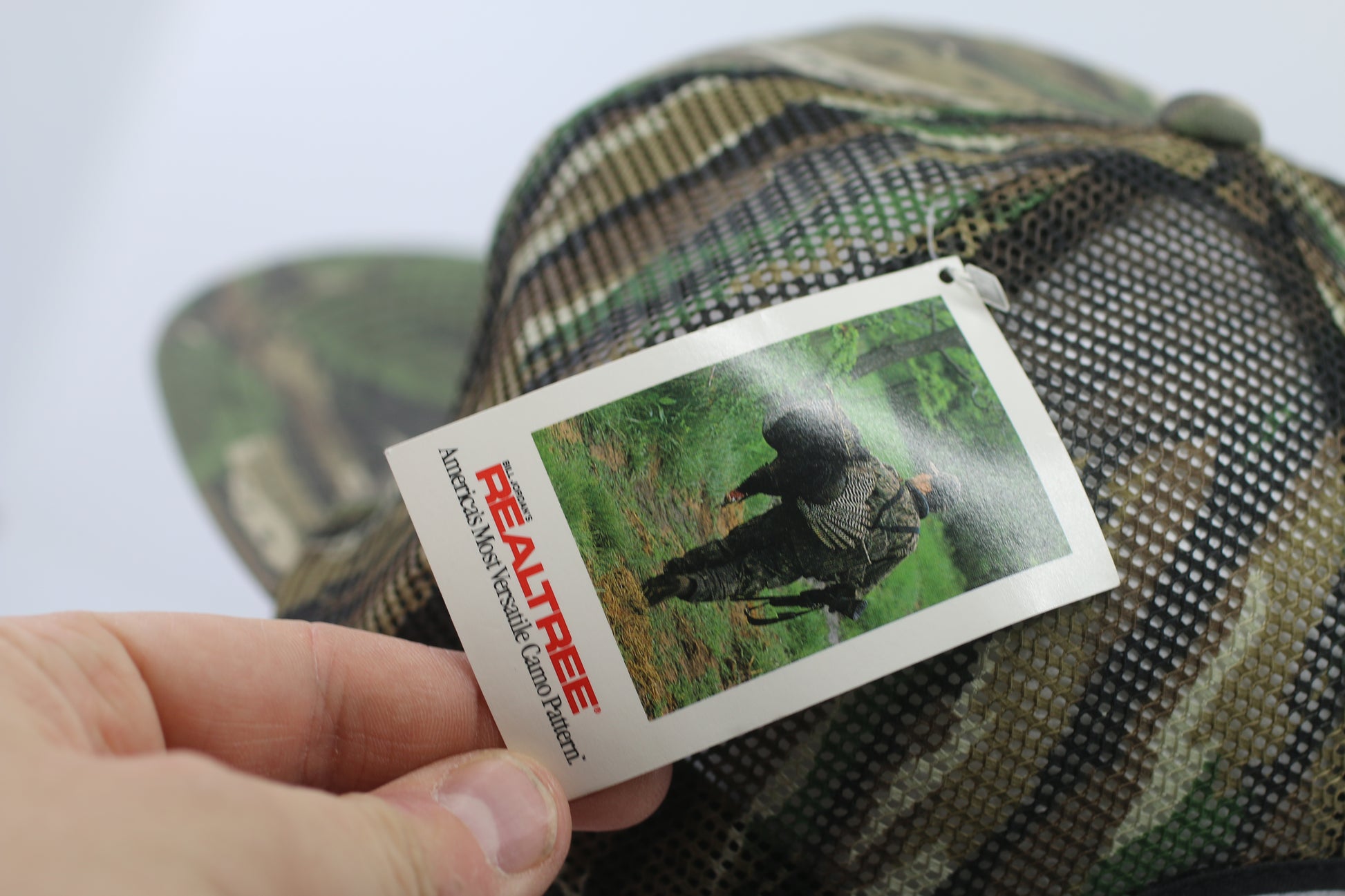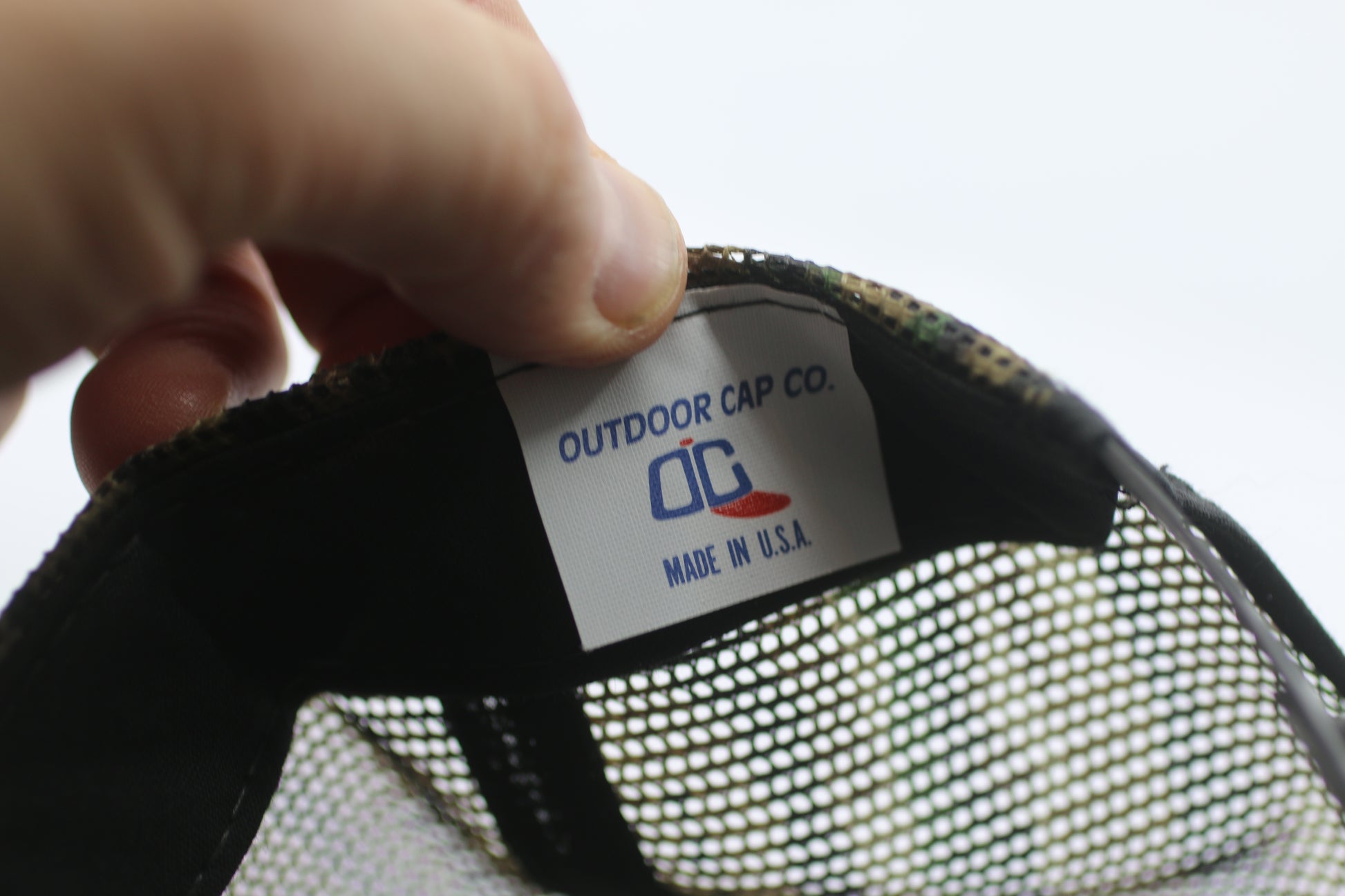 This cap features a fully embroidered front logo and classic outdoor camouflage pattern. Manufactured by Outdoor Cap Co., it is Made in U.S.A., a highly desirable detail among vintage workwear and Americana collectors.