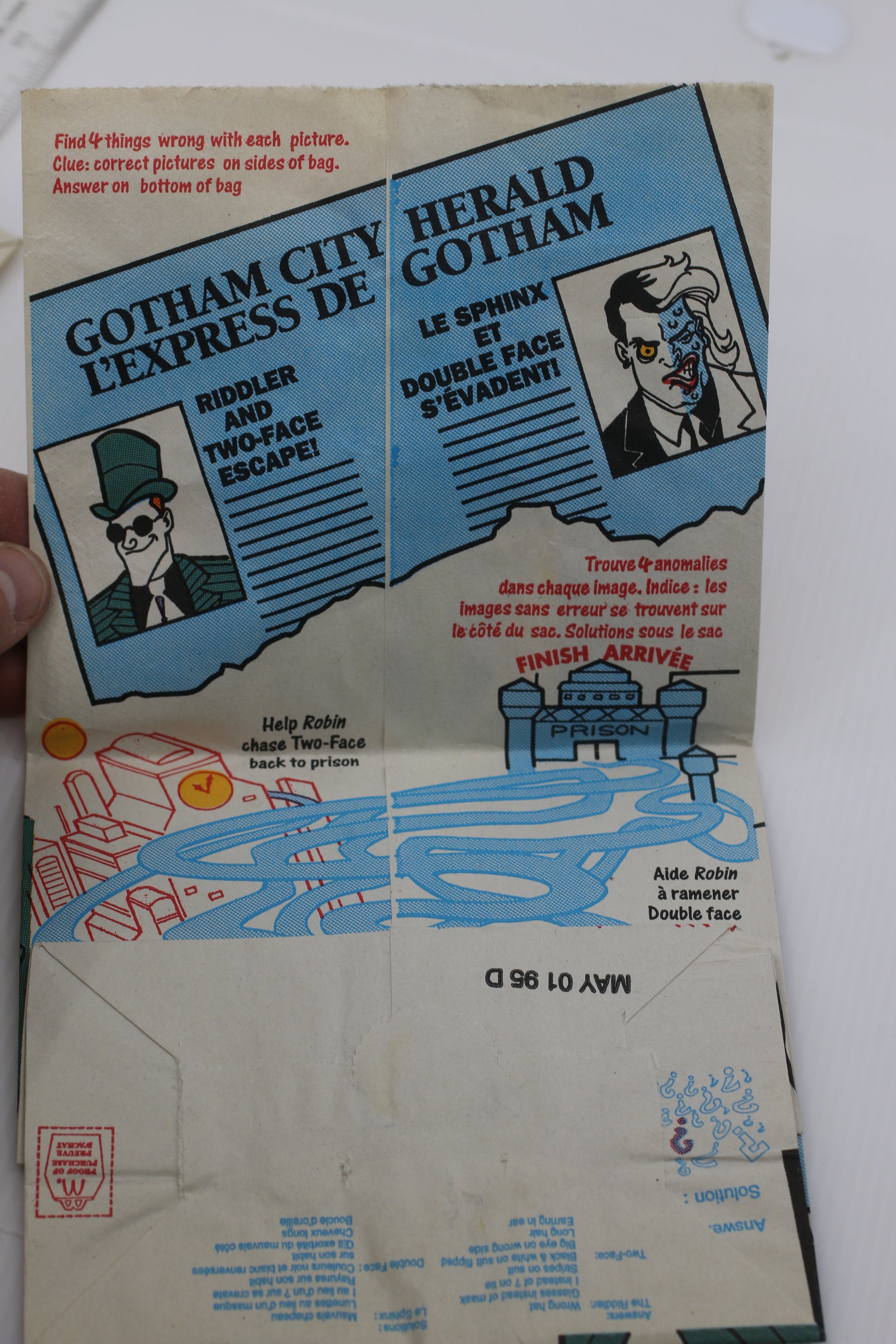 Original fast-food promotional item from the 1990s, with bilingual text and puzzle-style graphics.